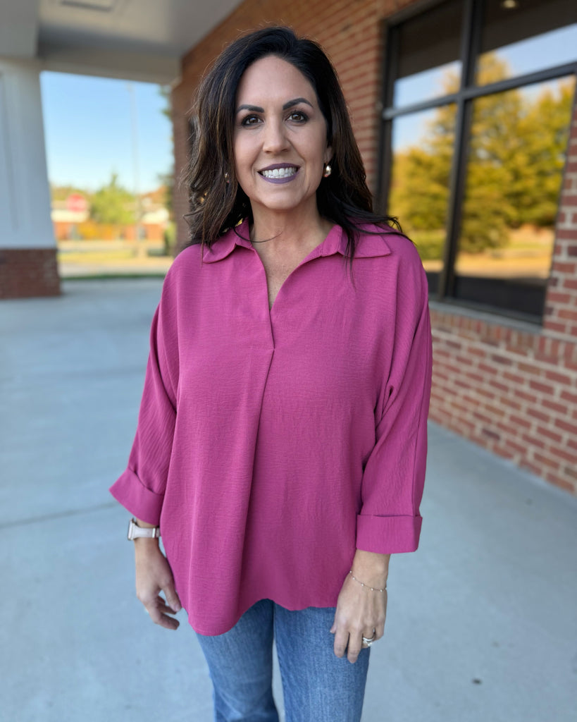 Elevate your everyday wardrobe with our effortlessly chic Bradley woven top in a soft dusty mauve. Featuring a classic collared neckline and 3/4 sleeves, it strikes the perfect balance between relaxed and refined. The lightweight woven fabric drapes beautifully, making it ideal for layering or wearing on its own for a polished, versatile look.
