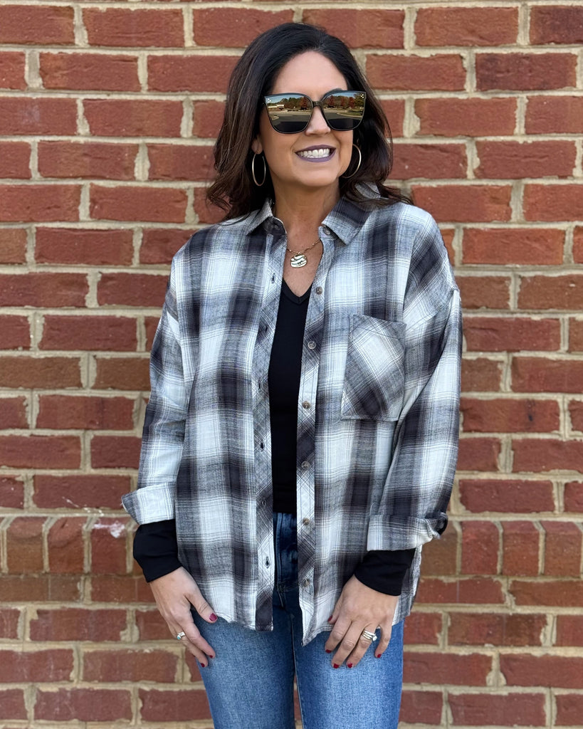 Stay cozy and stylish in our Dana Oversized Charcoal Flannel in Charcoal — a timeless classic with a modern, relaxed twist. Crafted from ultra-soft fabric, this plaid button-down features a collared neckline, long sleeves, and a single front chest pocket for that laid-back, lived-in feel. Designed with drop shoulders, side slits, and a rounded hem that falls below the hip, it offers an effortlessly oversized fit perfect for layering. A must-have for the fall-to-winter transition, this flannel pairs perfectly with your favorite denim or leggings for an easy, cozy look.