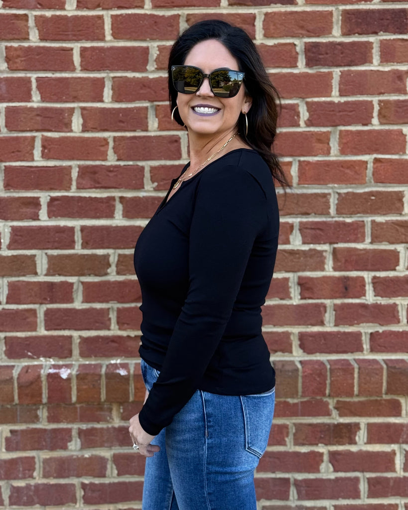 Meet your new everyday essential — our Dawn Soft Basic Tee in Black. Designed with a notched scoop neckline and a subtle split neck detail, this top combines classic simplicity with a touch of modern style. The soft, stretchy knit fabric offers all-day comfort, while the regular slim silhouette and relaxed fit flatter every shape. Falling at a high-hip length, it’s the perfect layering piece that transitions effortlessly from season to season. Pair it with jeans, shorts, or layered under your favorite jacket for a versatile, polished look year-round.