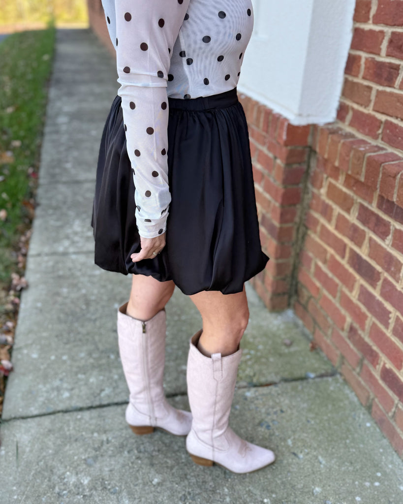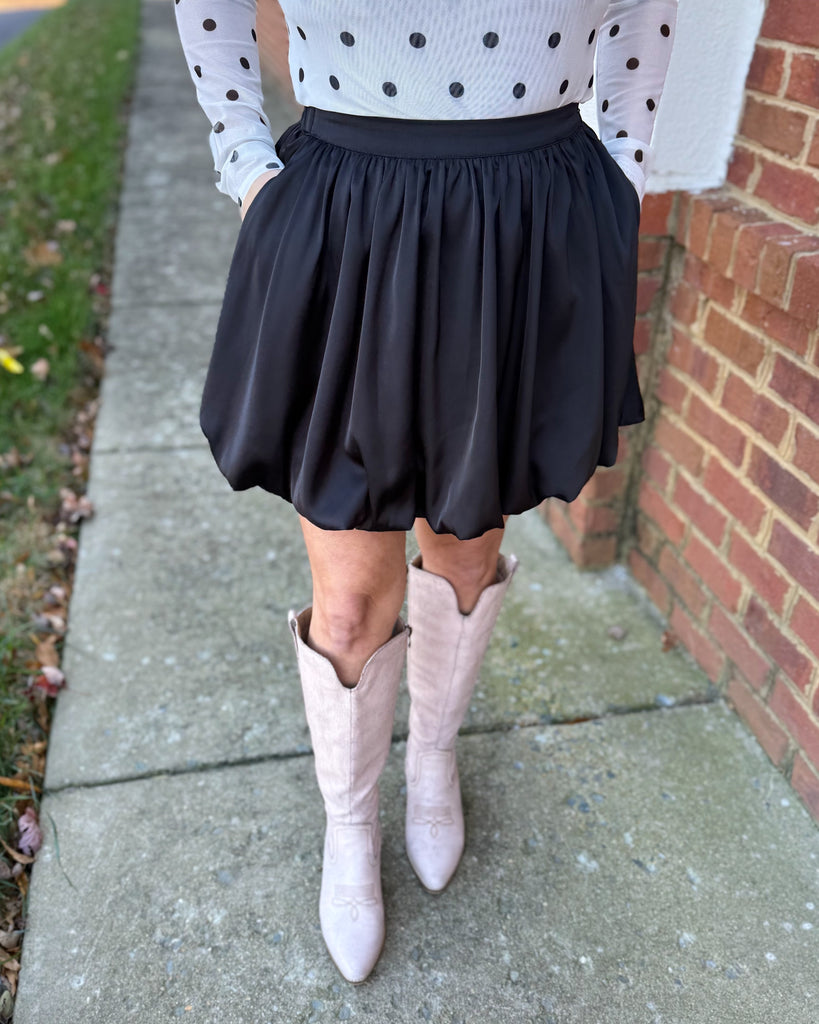 Chic meets playful in our Asher satin bubble skirt. Designed with a subtle sheen for a touch of sophistication, it features a flattering bubble silhouette that adds volume and style. The side zip closure ensures a smooth fit, while the elastic back waistband offers comfort and flexibility. Complete with side pockets and a full lining for effortless wear — it’s the perfect mix of polished and fun for your next night out or holiday event.