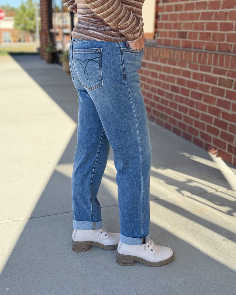 Meet your new everyday favorite jeans from Judy Blue! Designed with a flattering mid-rise waist and a gently tapered leg, these jeans give you that relaxed boyfriend fit without feeling too slouchy. The medium blue wash offers a timeless, lived-in look, while the cuffed hem adds a touch of effortless style. Crafted from Judy Blue’s signature soft stretch denim, they move with you while holding their shape all day long.