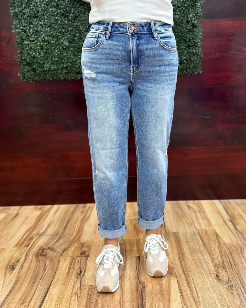 These medium wash jeans are designed with a boyfriend fit, high-rise, and styled with a cuffed hem that can be unrolled for a longer inseam. With a classic cut and cropped length, these jeans are the perfect addition to your wardrobe and can be styled year-round!