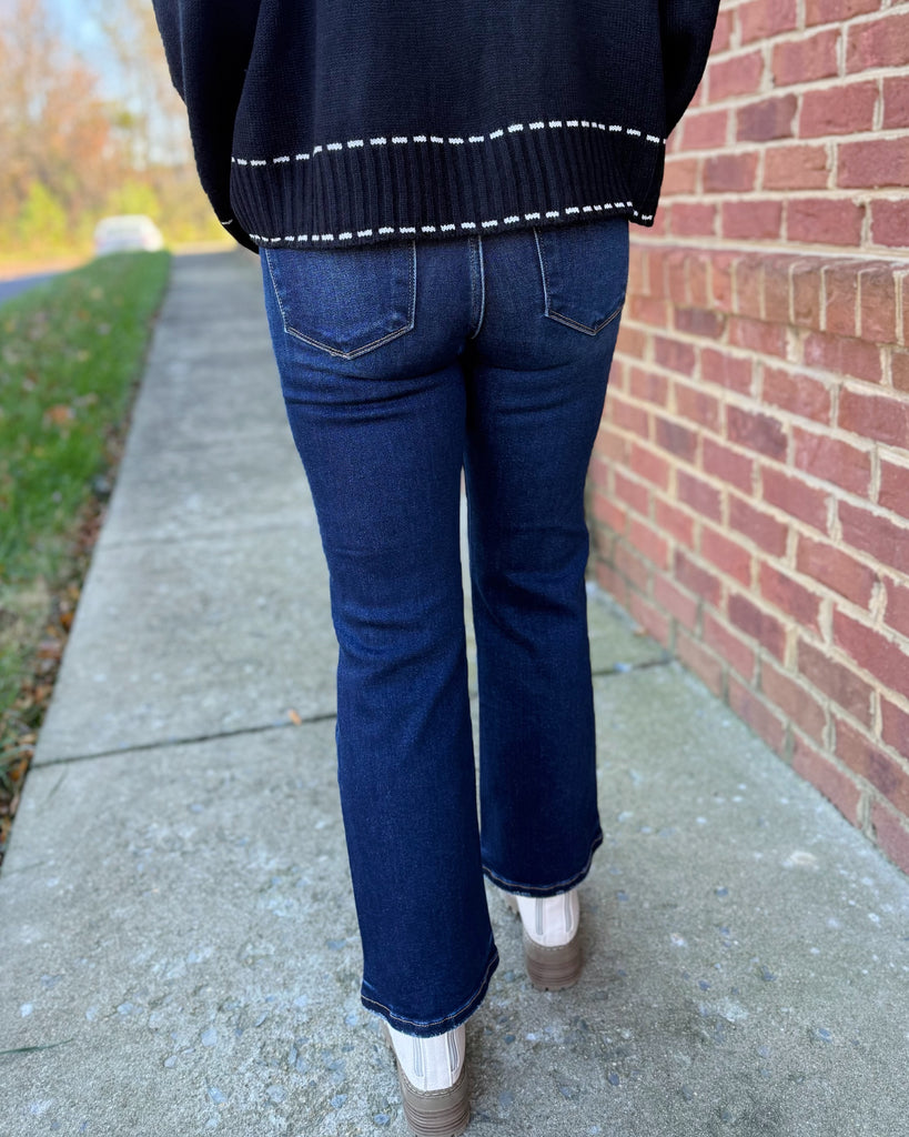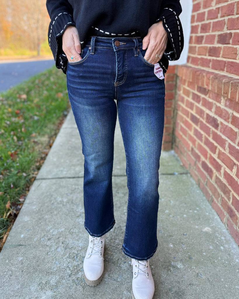 Flatter your figure with our Risen Tummy Control High Rise Crop Bootcut Jeans in a classic deep blue wash. Designed with a smoothing high-rise waistband for a supportive, slimming fit, these jeans offer both comfort and confidence. The clean, non-distressed finish gives them a polished look that’s perfect for dressing up or keeping casual. Crafted from soft, stretchy denim that moves with you, the cropped bootcut silhouette pairs beautifully with boots, heels, or sneakers for effortless everyday style.