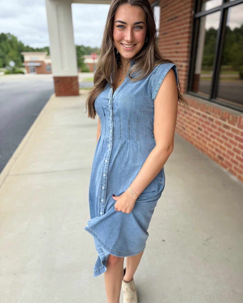 Effortlessly versatile, our Wynn Midi Denim Shirt Dress is a timeless staple for any wardrobe. Designed with functional front buttons for easy wear and styling, it features classic shirt-dress details in a flattering midi length. Side pockets add everyday practicality, while the denim fabric offers a chic yet laid-back feel. Perfect for dressing up with heels or keeping it casual with sneakers, this piece transitions seamlessly from weekday to weekend.
