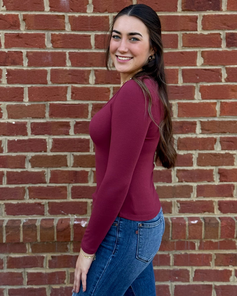 Keep it simple and chic with our Devin Basic Scoop Neck Long Sleeve Top in Burgundy — your go-to essential for any season. Designed with a flattering scoop neckline, this stretchy top offers a sleek, body-skimming fit that’s perfect for layering or wearing on its own. The soft, comfortable fabric moves with you, making it an effortless choice for everyday wear. From casual days to classic looks, this versatile piece pairs seamlessly with everything from high-waisted jeans to skirts and blazers.