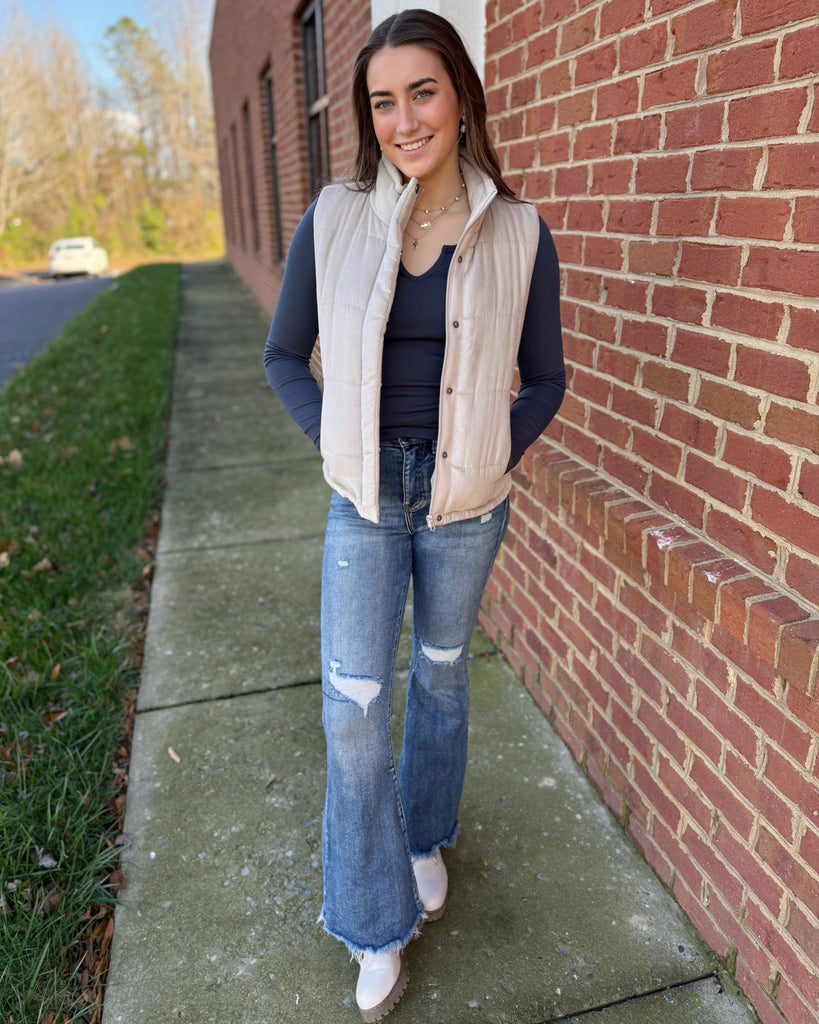 Add a touch of luxe texture to your outerwear with our Drew Suede-Like Puffer Vest in Beige. Designed with a soft-touch finish and lightweight padding, this cozy vest offers both comfort and style. It features a high neck collar for added warmth, secure zipper and snap button closures, and convenient side pockets. Perfect for layering through the cooler seasons, it’s an effortless piece that elevates any casual look.