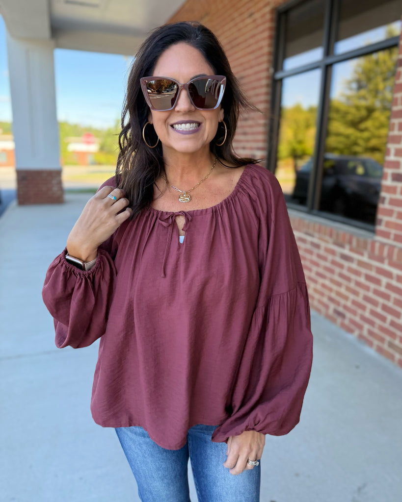 Effortlessly chic and perfectly relaxed, our Jillian Drop Shoulder Loose Blouse in wine is a wardrobe essential for easy, elevated style. Designed with a flowy silhouette and soft drape, it features a flattering drop shoulder fit and an adjustable neckline with delicate straps for a customizable look. This versatile blouse pairs beautifully with denim, skirts, or tailored pants for a polished yet laid-back finish.