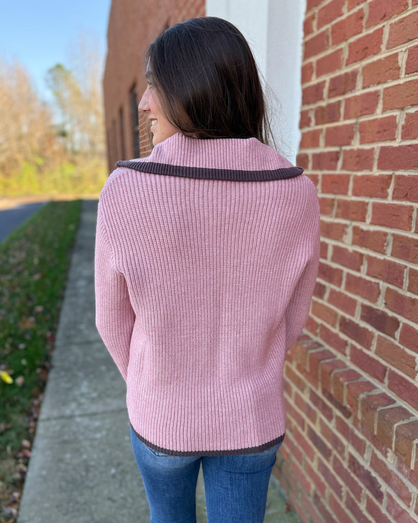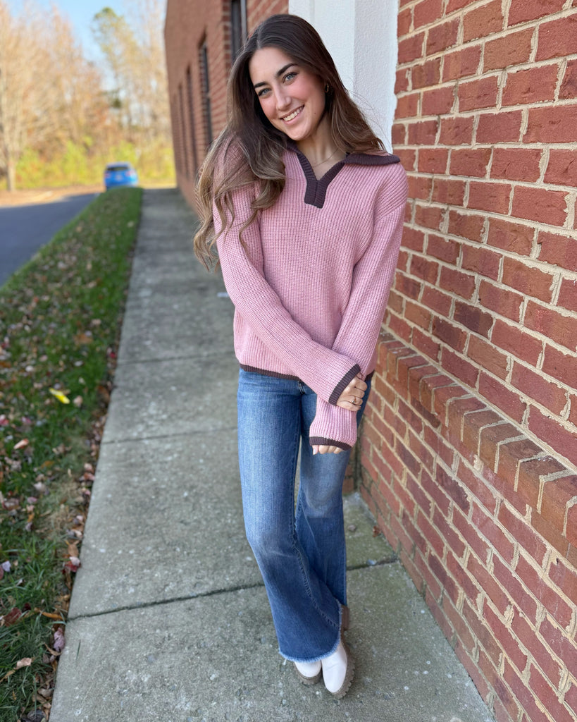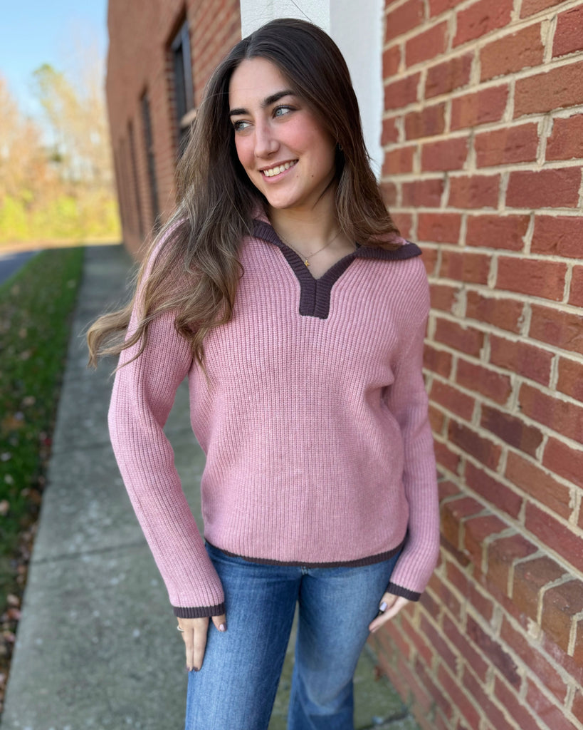 Effortlessly chic and cozy, our Nia long sleeve sweater in rose features a classic collared neckline with eye-catching contrast trim for a polished, modern touch. The soft knit fabric offers all-day comfort, while the tailored fit gives it a refined silhouette. Perfect for pairing with denim or trousers for an elevated everyday look that transitions seamlessly from work to weekend.
