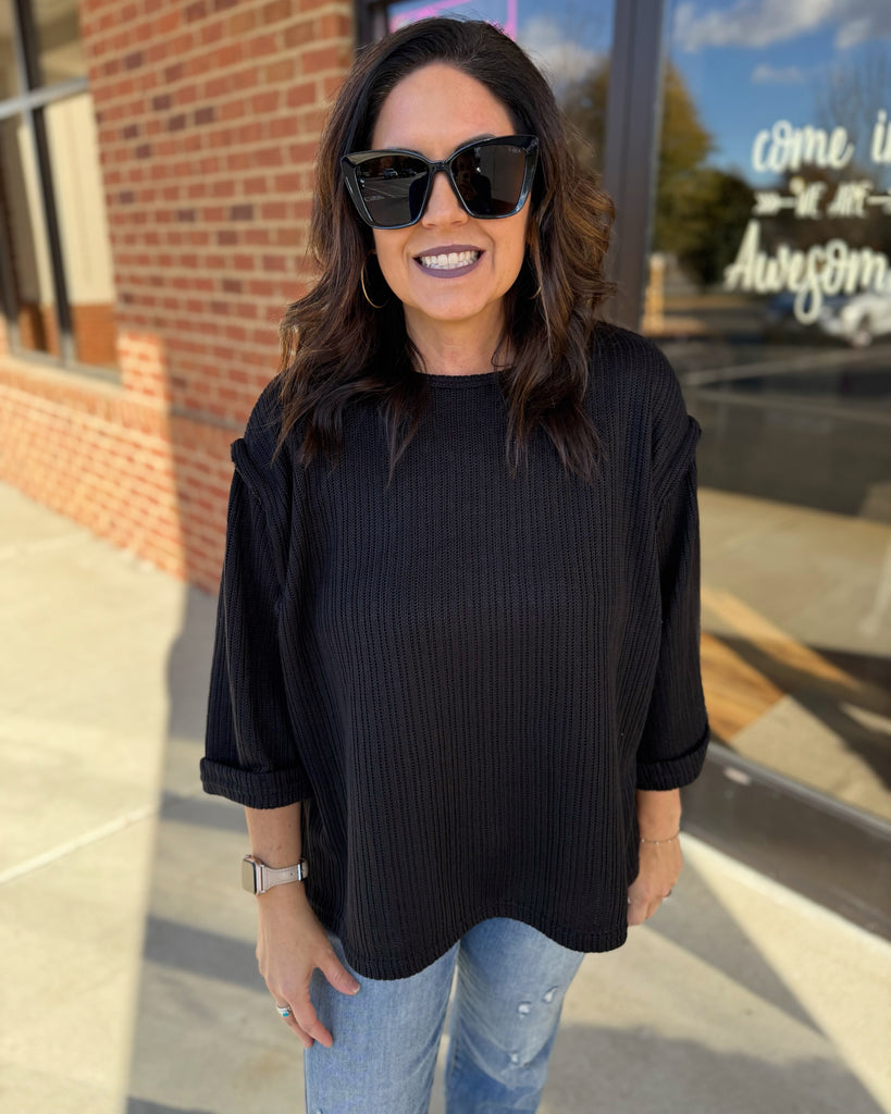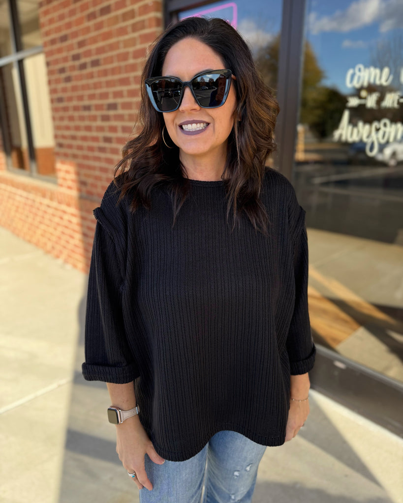Effortlessly stylish, our Ryder 3/4 Folded Sleeve Knit Top in Black offers a perfect blend of comfort and chic versatility. Crafted from a soft, lightweight knit fabric, this top features relaxed 3/4 sleeves with a subtle folded cuff detail that adds a polished touch. The muted slate hue makes it an easy-to-pair staple for any wardrobe, ideal for layering or wearing solo. With its flattering relaxed fit and breathable feel, this knit top transitions seamlessly from casual days to laid-back evenings.