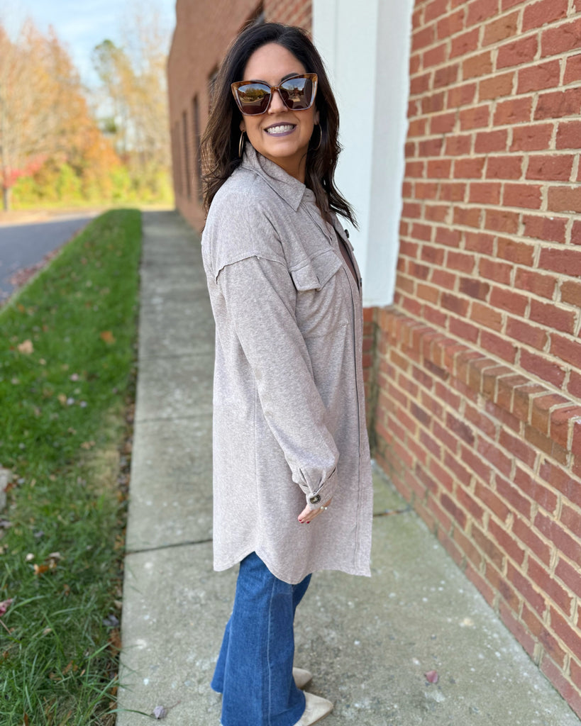Cozy meets classic in our Sutton Brushed Knit Long Line Button Down Shacket. Designed in a warm mocha hue, this versatile piece features a soft brushed knit fabric that offers both comfort and effortless style. The longline silhouette provides extra coverage, while the button-down front, collared neckline, and chest pockets give it that timeless shirt-jacket appeal. Perfect for layering over tees or sweaters, this shacket transitions seamlessly from casual outings to laid-back weekends.
