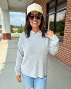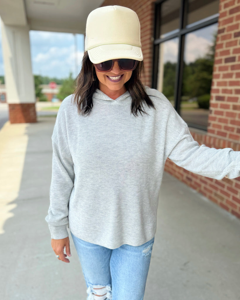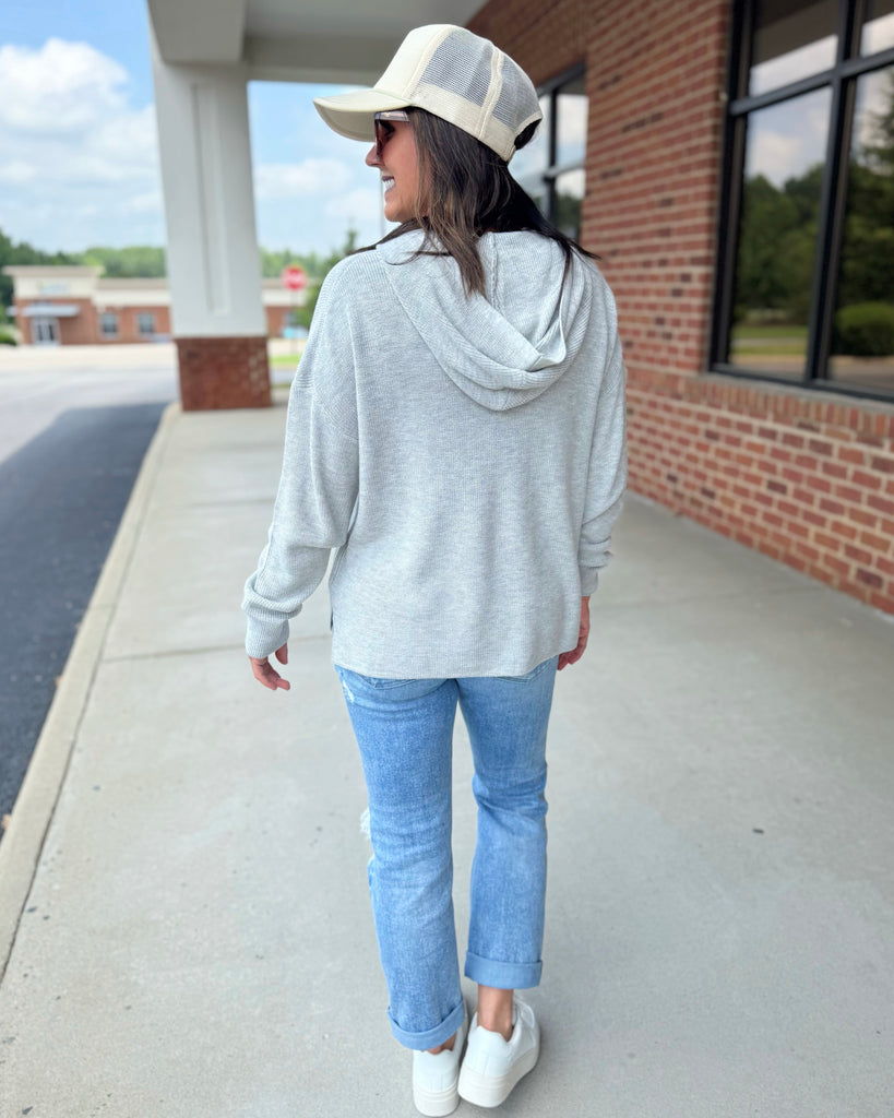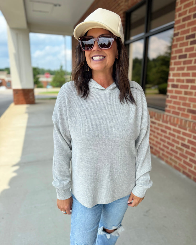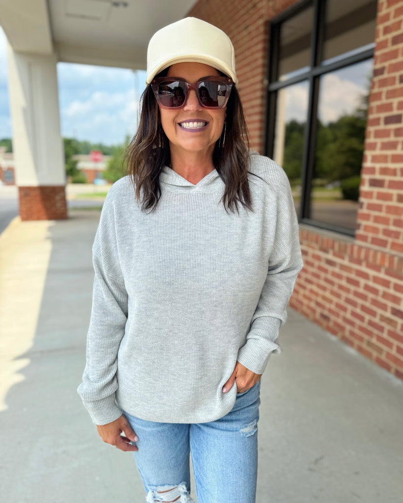 Stay cozy without the bulk in our Laney Hooded Lightweight Sweater Top in Heather Grey.