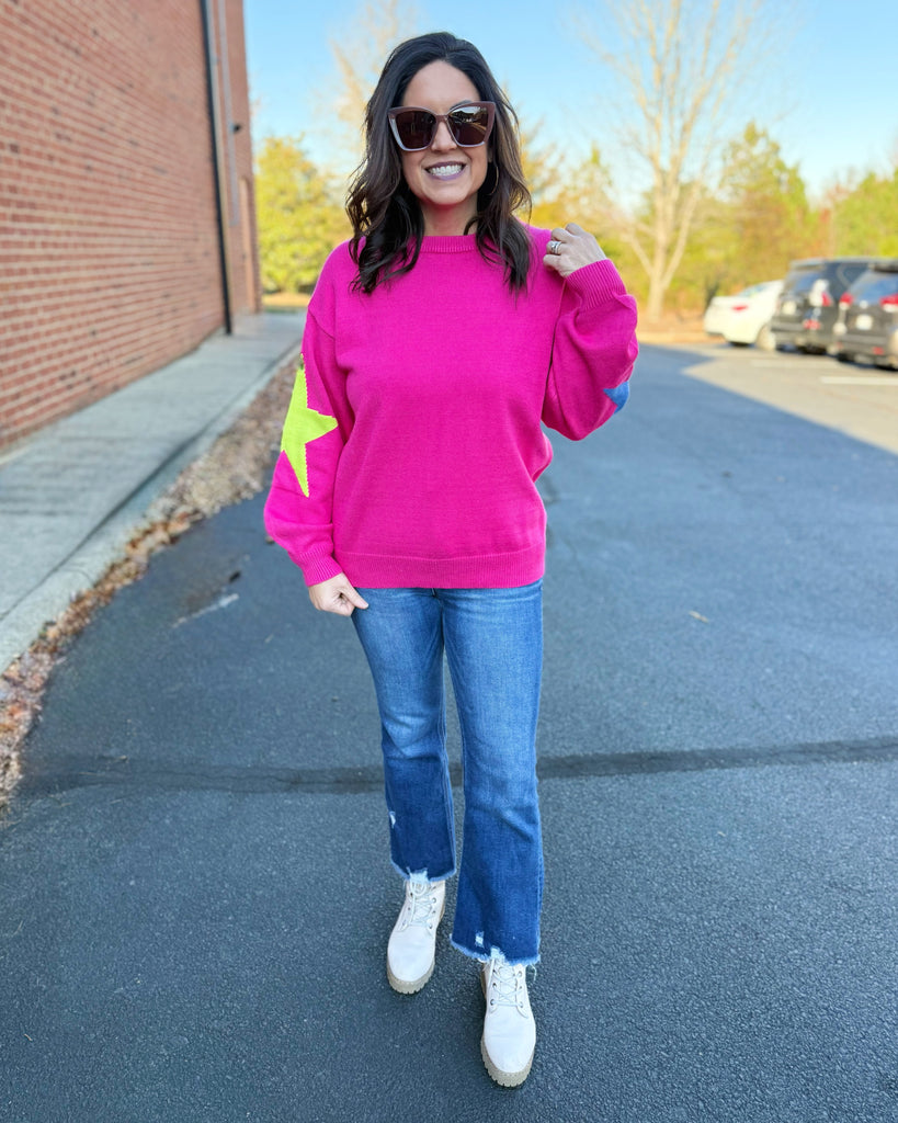 Crafted in a soft, cozy knit, this standout sweater features an star pattern on the sleeves that adds just the right amount of whimsy. The long sleeves and relaxed silhouette keep it comfortable for all-day wear, while the vibrant hot pink hue brings a cheerful pop of color to any outfit.