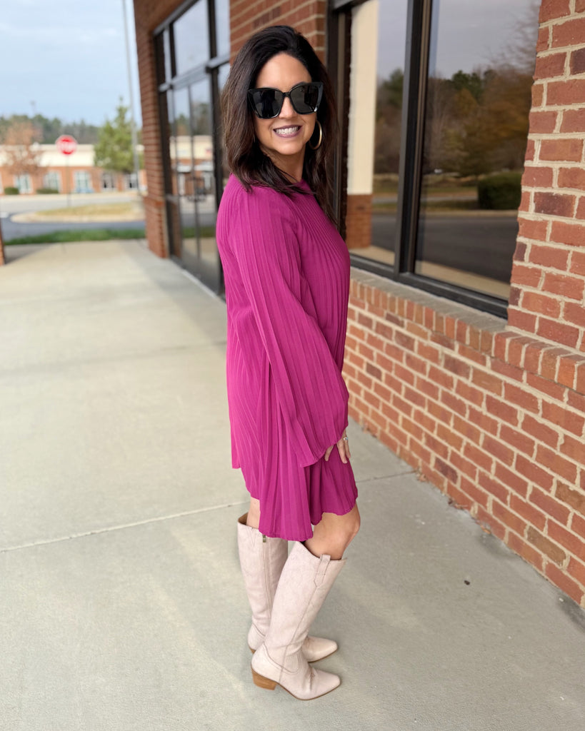 Elevate your everyday elegance with our stunning Natalie pleated woven dress in a rich berry hue. Designed with long sleeves and a flattering silhouette, it features soft pleating that adds beautiful movement and a touch of sophistication. The woven fabric drapes effortlessly, offering comfort while maintaining a polished finish.