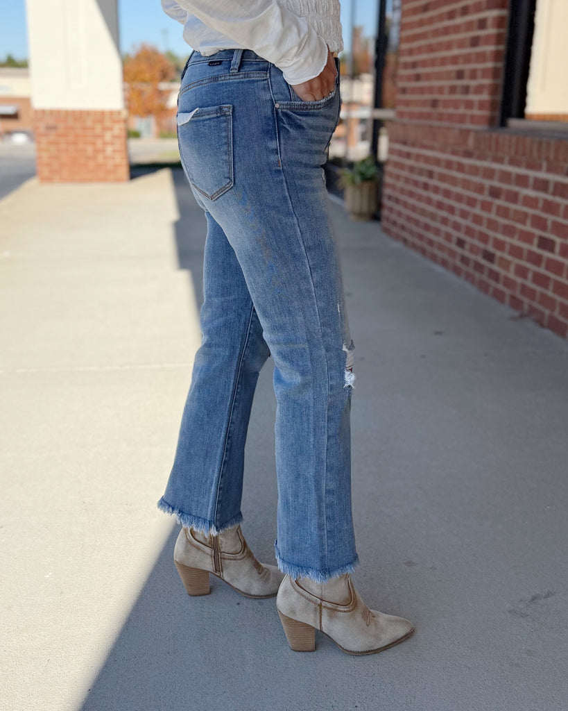 These jeans combine the best of both worlds with their classic design and trendy details. The high-rise waist provides a flattering and comfortable fit, while the frayed hem gives these jeans a laid-back and edgy vibe, perfect for casual outings. And of course, the bootcut leg adds a flattering shape and versatility to your wardrobe.