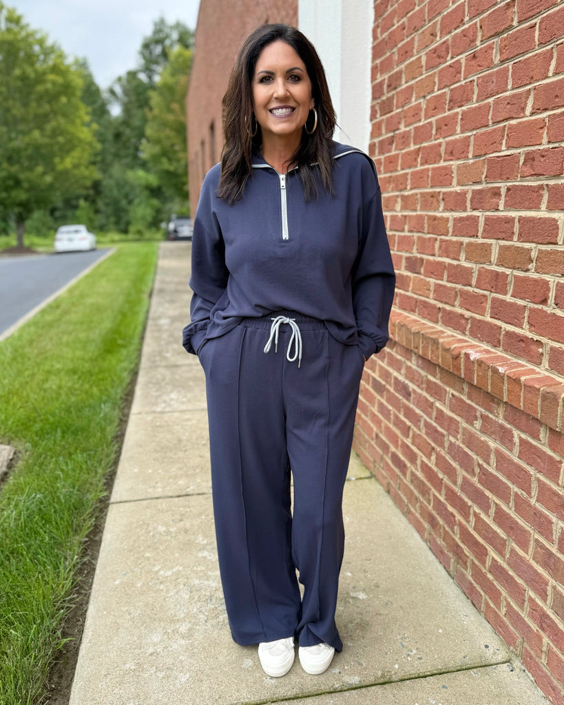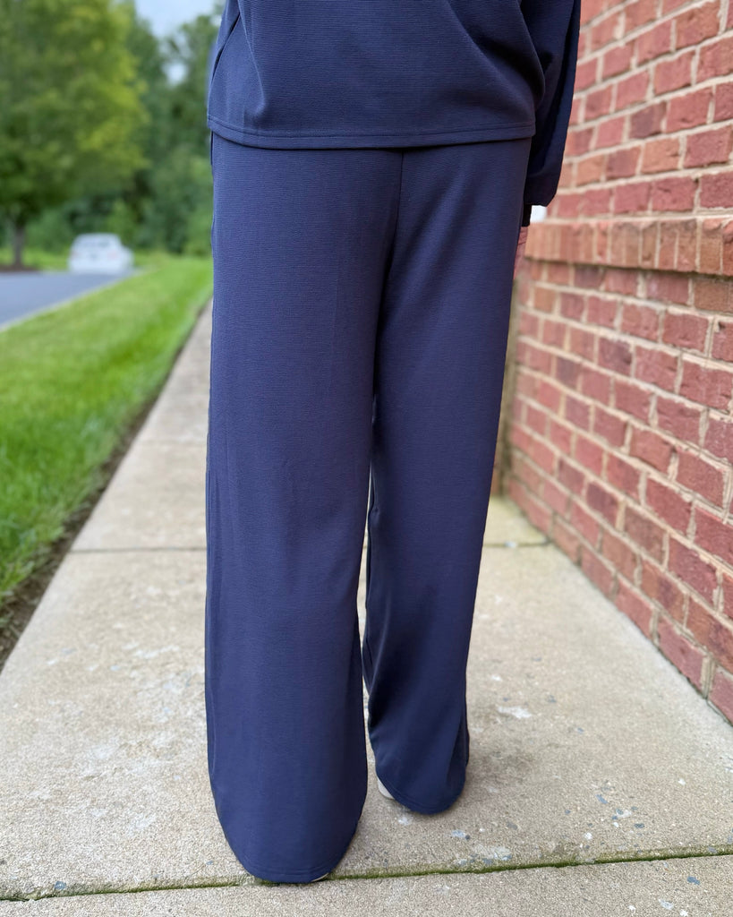 Effortlessly chic and ultra-comfortable, these navy wide-leg knit pants are a versatile addition to any wardrobe. Designed with a drawstring elastic waistband, they offer a customizable, relaxed fit, while the flowing wide-leg silhouette ensures all-day comfort and ease of movement. Functional side pockets add practicality without sacrificing style, making these pants perfect for lounging at home or running errands. Soft, lightweight knit fabric keeps you cozy while maintaining a polished look from morning to night.