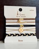 Our FOCUS hair tie bracelet set aims to please with perfectly coordinated neutrals and gold metal accents. The intersecting arrows on the round gold charm symbolize friendship, pointing in the right direction, and hitting your desired destination.
