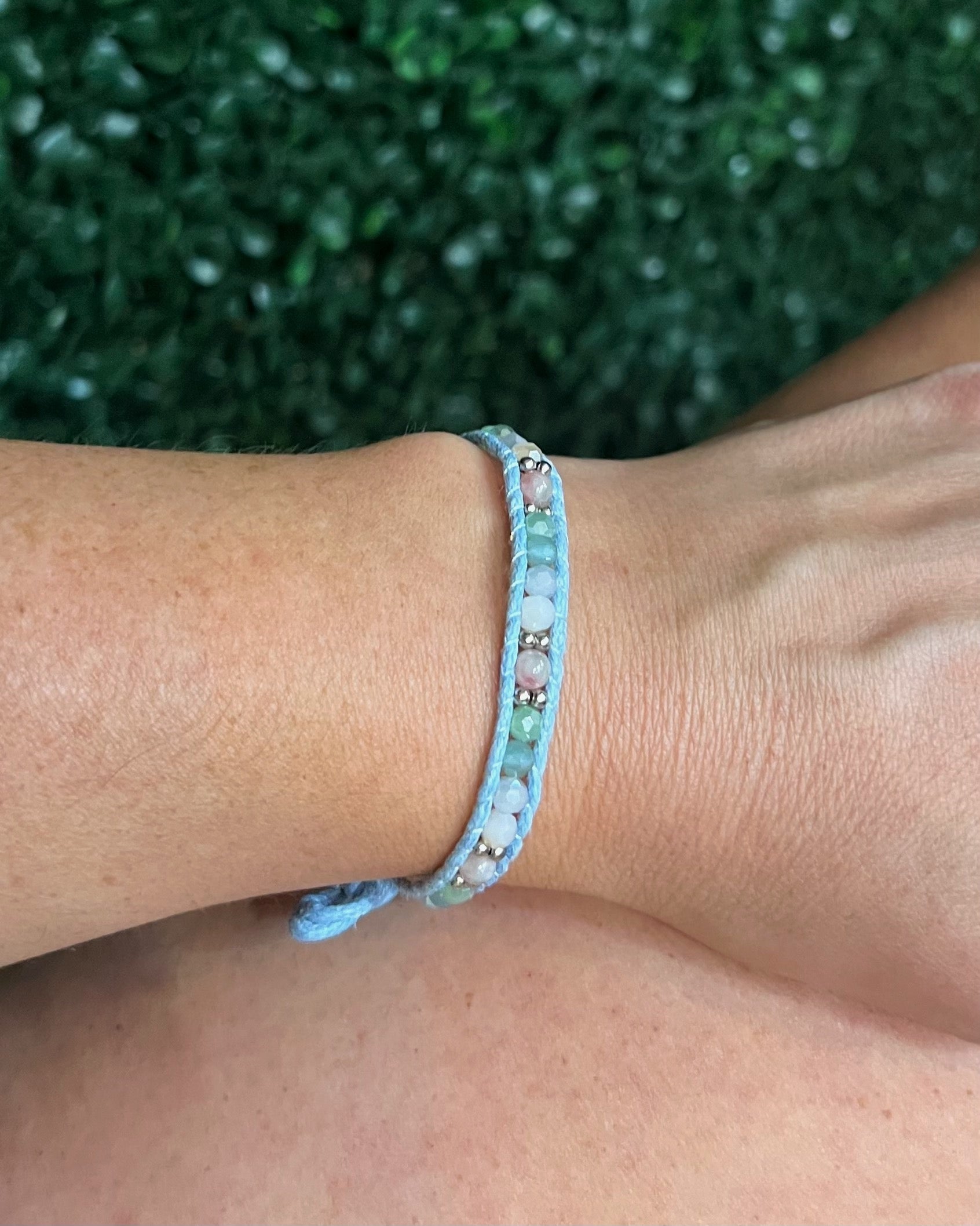 Materials: Jade, Sky Blue, Mint, Orange Crystals and Adjustable 100% Cotton Cord