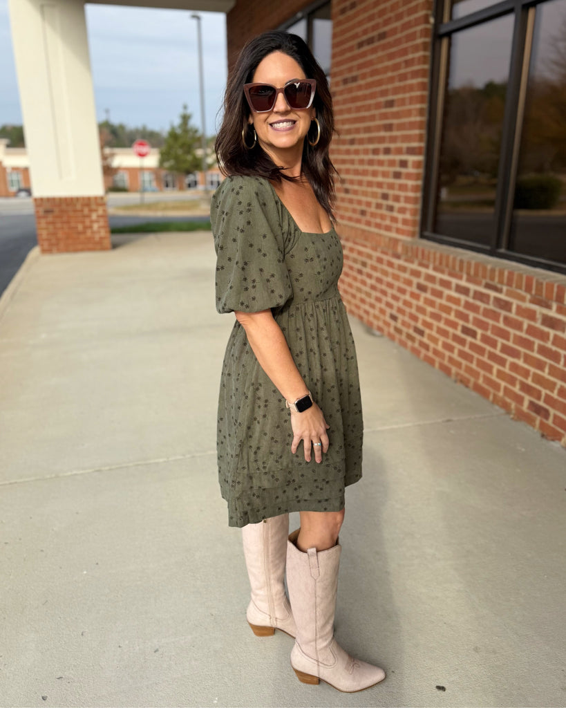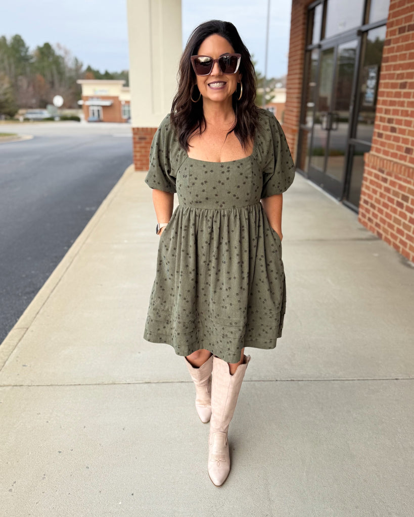 Soft, feminine, and effortlessly charming — our Bess floral corduroy dress brings cozy texture and timeless style together in one dreamy piece. Designed in a warm olive hue with a subtle floral pattern, it features a classic babydoll silhouette that offers an easy, relaxed fit while still feeling polished.