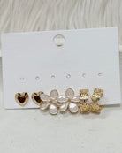 Three-piece huggie hoop earring set, featuring dainty heart, flower and seashell hoops. Designed with a gold-tone finish and lightweight feel.