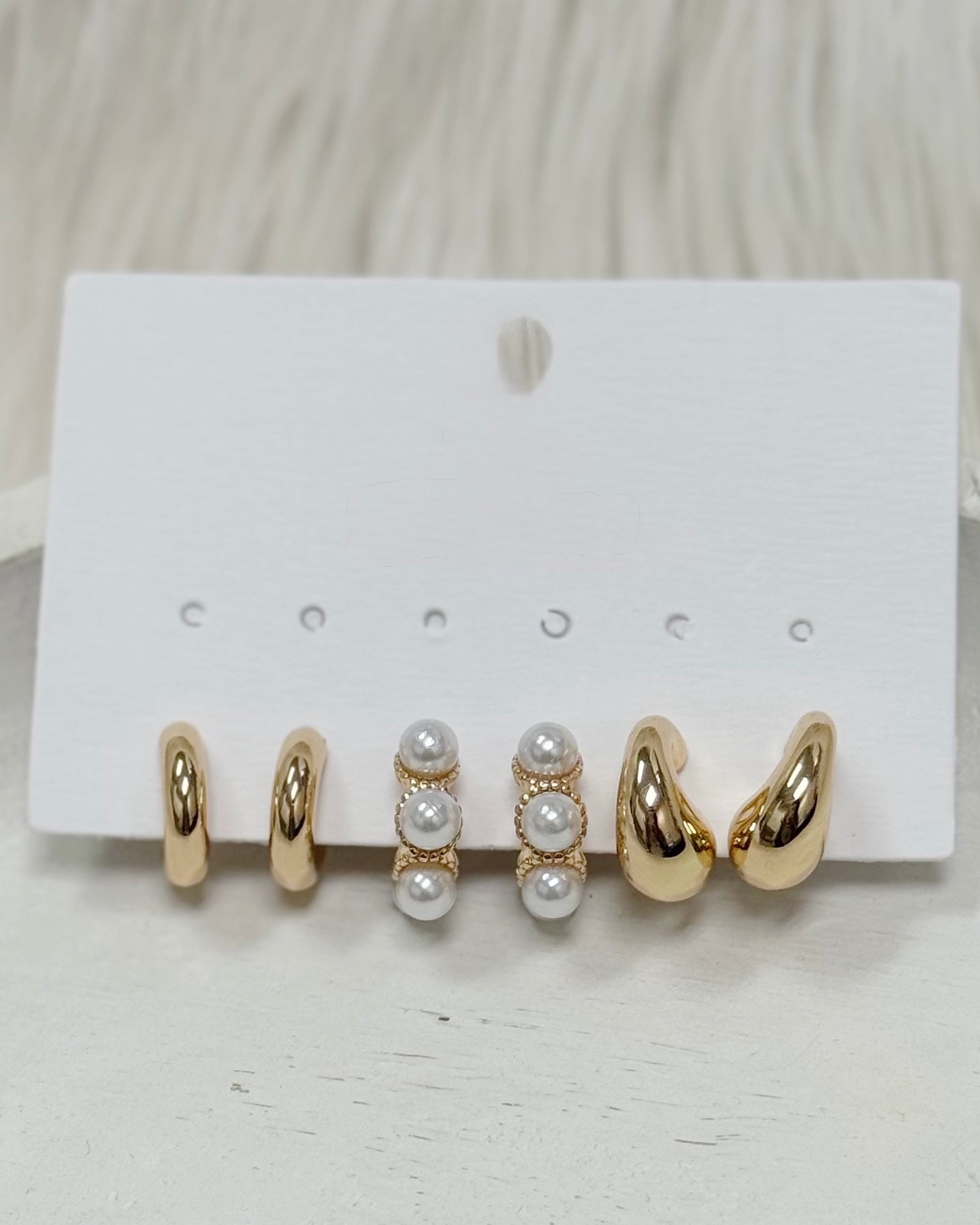 This stylish set features three pairs of huggie hoops in radiant gold, accented with elegant pearls for a touch of sophistication. Lightweight and comfortable, they provide a secure fit, perfect for all-day wear.