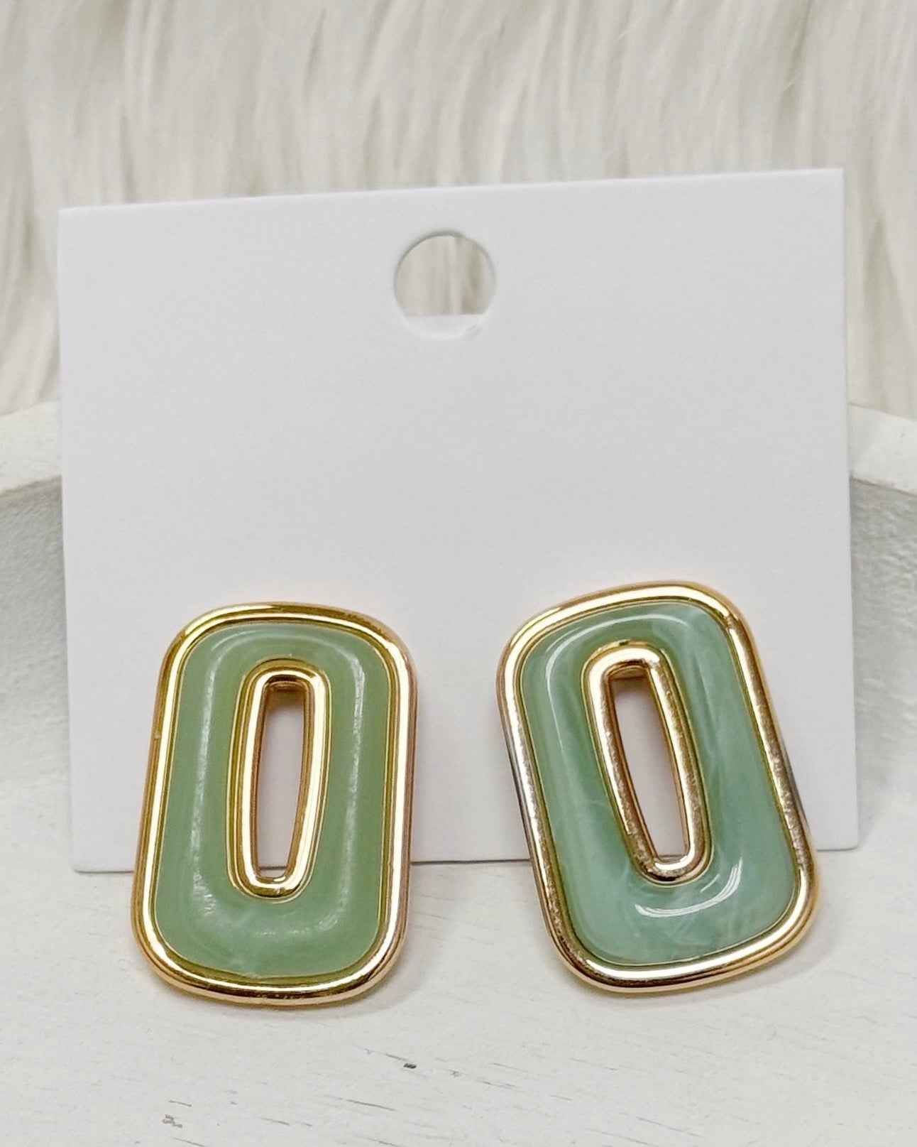 Gold-rimmed stud earrings features bold rectangle shapes with glossy enamel-one in soft sage green, centered by an elongated cutout for modern geometric appeal. Effortlessly chic, they add subtle color and contemporary polish to everyday styles.