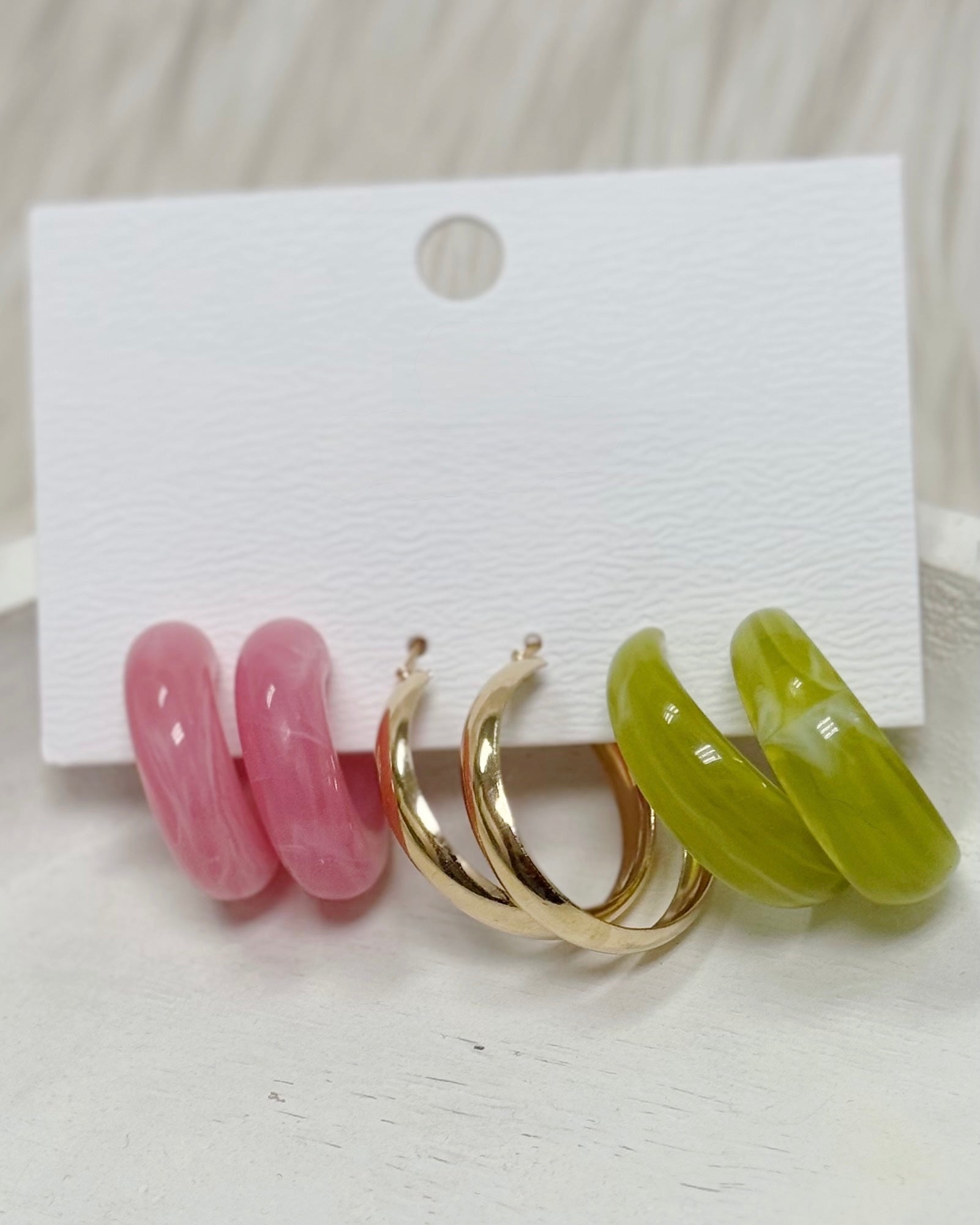 Featuring three pairs of classic hoop earrings in varying sizes, allowing you to mix and match or wear them individually for different looks.