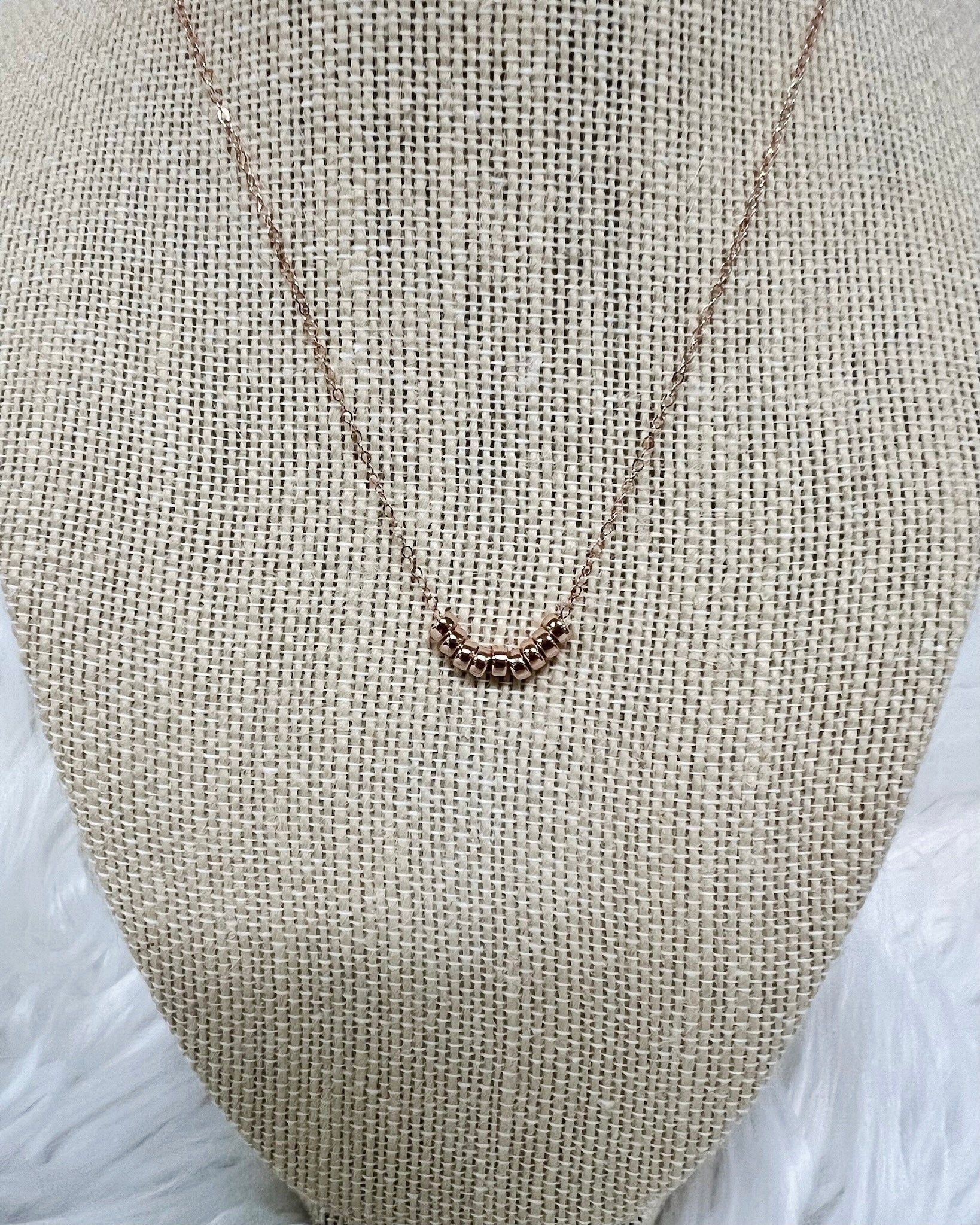 A simple and elegant round disc beaded necklace in 14k Rose Gold Fill on a matching 18" chain. Gorgeous, minimalist and perfect for layering!