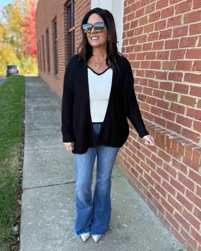 Wrap yourself in effortless style with our Maple Dolman Sleeve Cardigan in black. Designed with a relaxed silhouette, this layering piece drapes beautifully for a flattering fit. The dolman sleeves add a modern touch, while the open front makes it easy to slip on and off for all-day versatility. Perfect for pairing with jeans, dresses, or tailored pants, this cardigan brings a warm pop of color and timeless ease to your wardrobe.