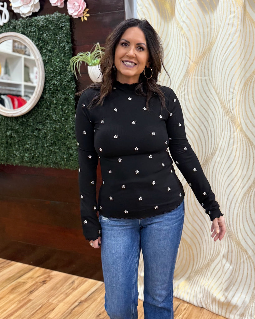 Elevate your everyday style with our stunning Violette embroidered rib knit top. Designed in a sleek black hue, it features delicate floral embroidery for a soft, feminine touch that stands out effortlessly. The mock neckline adds a chic, polished feel, while the subtle cabbage-hem edges along the sleeves and bottom bring playful texture and movement.