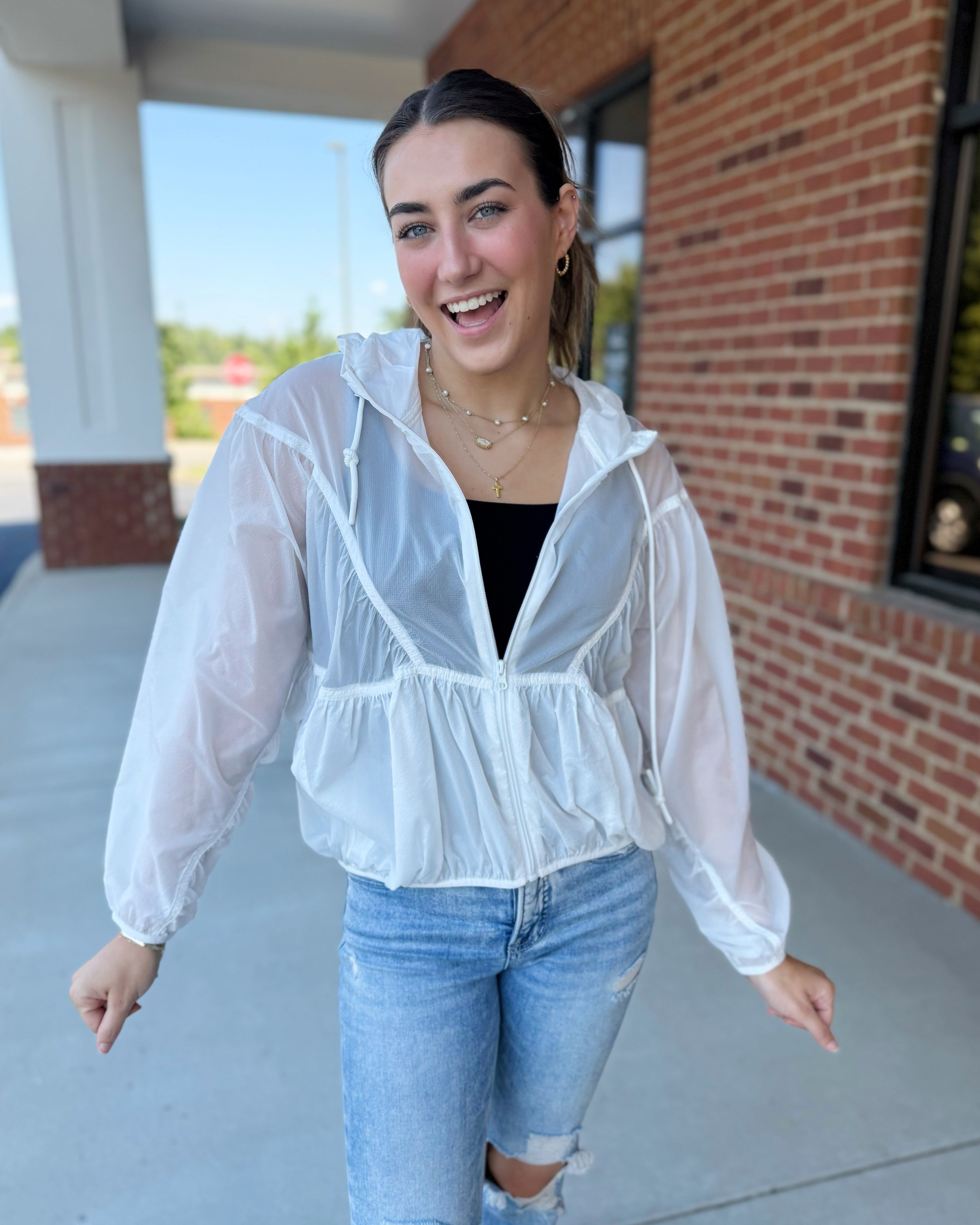 Lightweight and effortlessly cool, our Jocelyn Windbreaker Hooded Jacket is the perfect layer for breezy days. Designed with a semi-sheer finish, it offers an airy feel while adding a modern edge to your look. The zip-front closure makes it easy to throw on and go, while the roomy side pockets keep your essentials close at hand. Finished with a relaxed hood, this versatile jacket blends function and style for everyday wear.