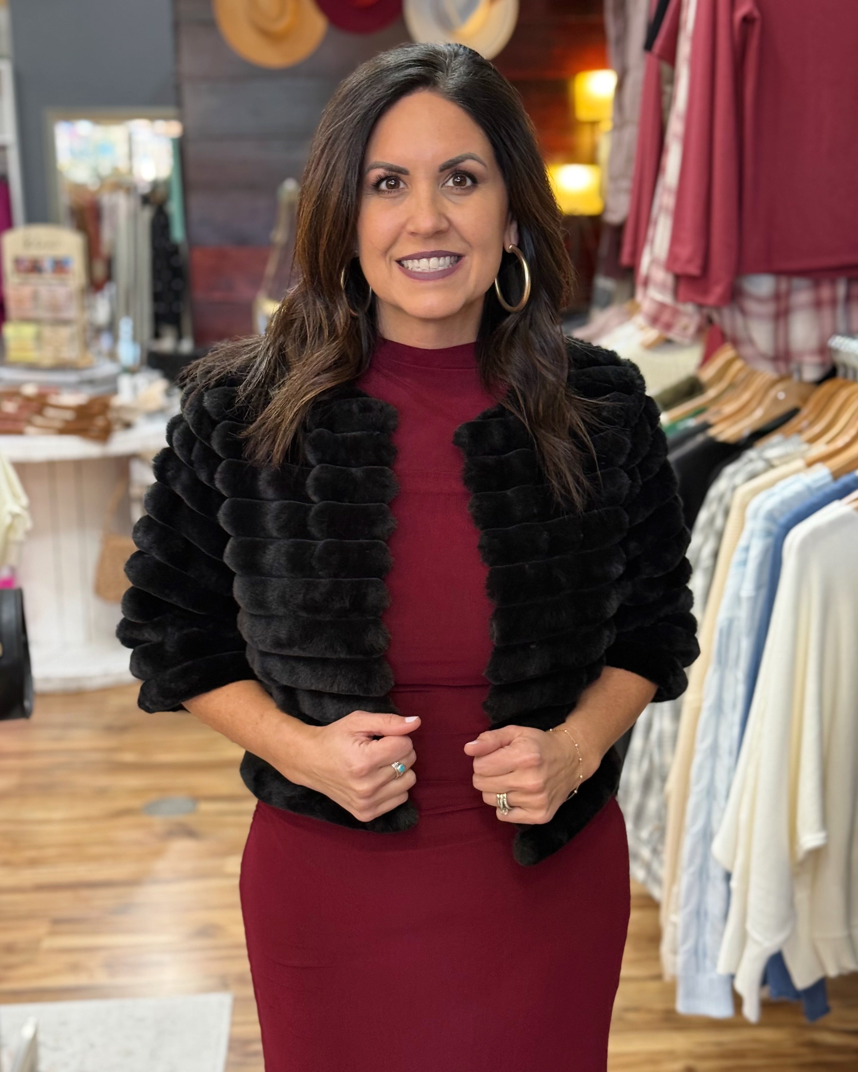 Make a statement without saying a word. Our Polly Half Sleeve Faux Fur Crop Jacket in classic black is the definition of chic, modern glamour. Designed with plush, ultra-soft faux fur, this cropped silhouette adds instant luxury to any look—whether you’re dressing up denim or layering over your favorite holiday dress.