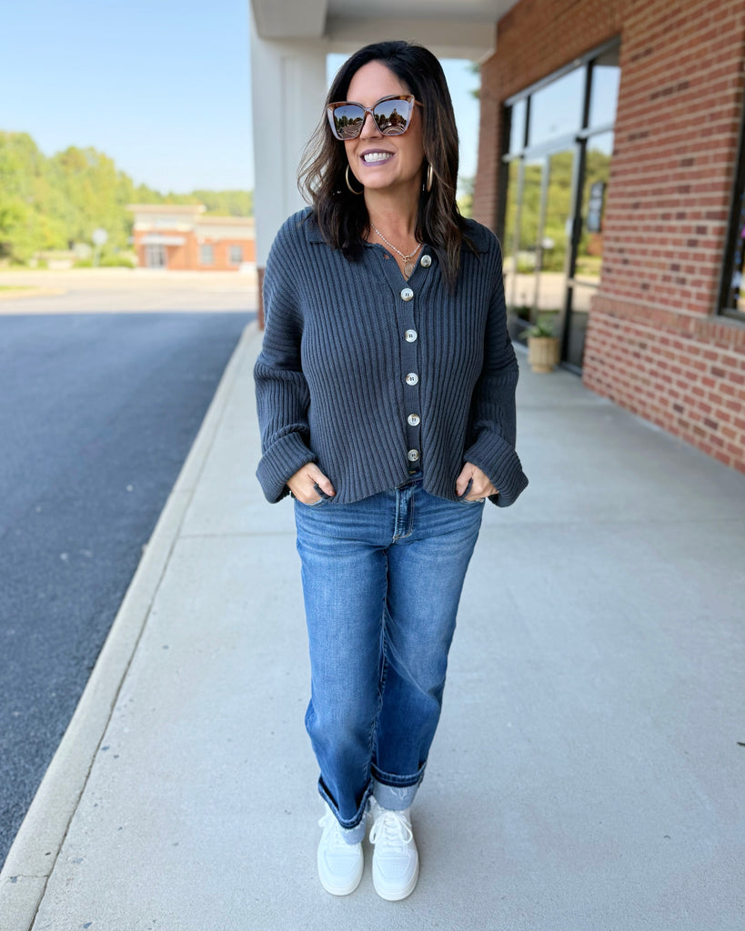 Elevate your everyday style with our Trisha ribbed button-down sweater in navy, designed with a folded collar for a timeless touch. Crafted in a soft, stretchy knit, it features long sleeves and a slim ribbed texture that flatters while keeping you cozy. The functional button-front closure makes it easy to wear open or closed, offering versatile styling from casual layering to a polished, tucked-in look. A wardrobe essential that blends comfort and sophistication.