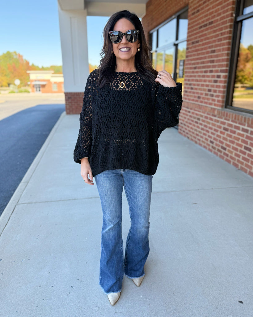 Embrace effortless, breezy style with our Addison open knit sweater in black. Crafted with a soft, crochet-inspired weave, it features a flattering boat neckline, dropped shoulders, and voluminous long sleeves for a relaxed, comfortable fit. Finished with chunky ribbed trim, this lightweight sweater layers beautifully for a timeless, classy look.