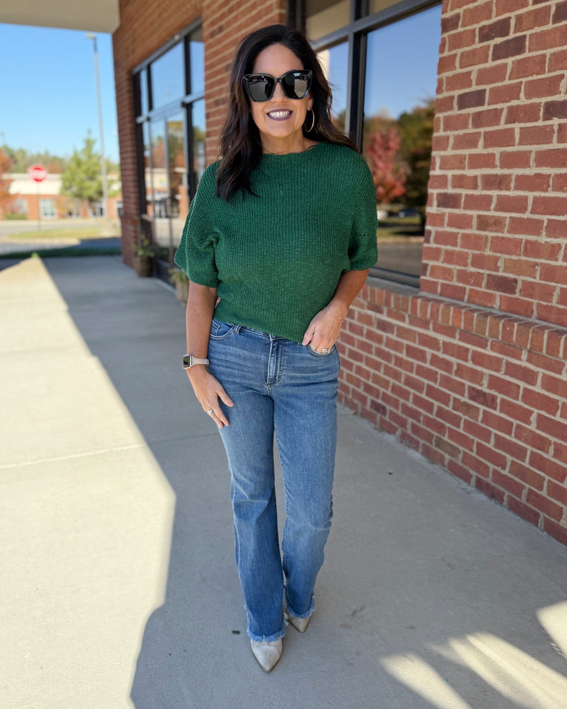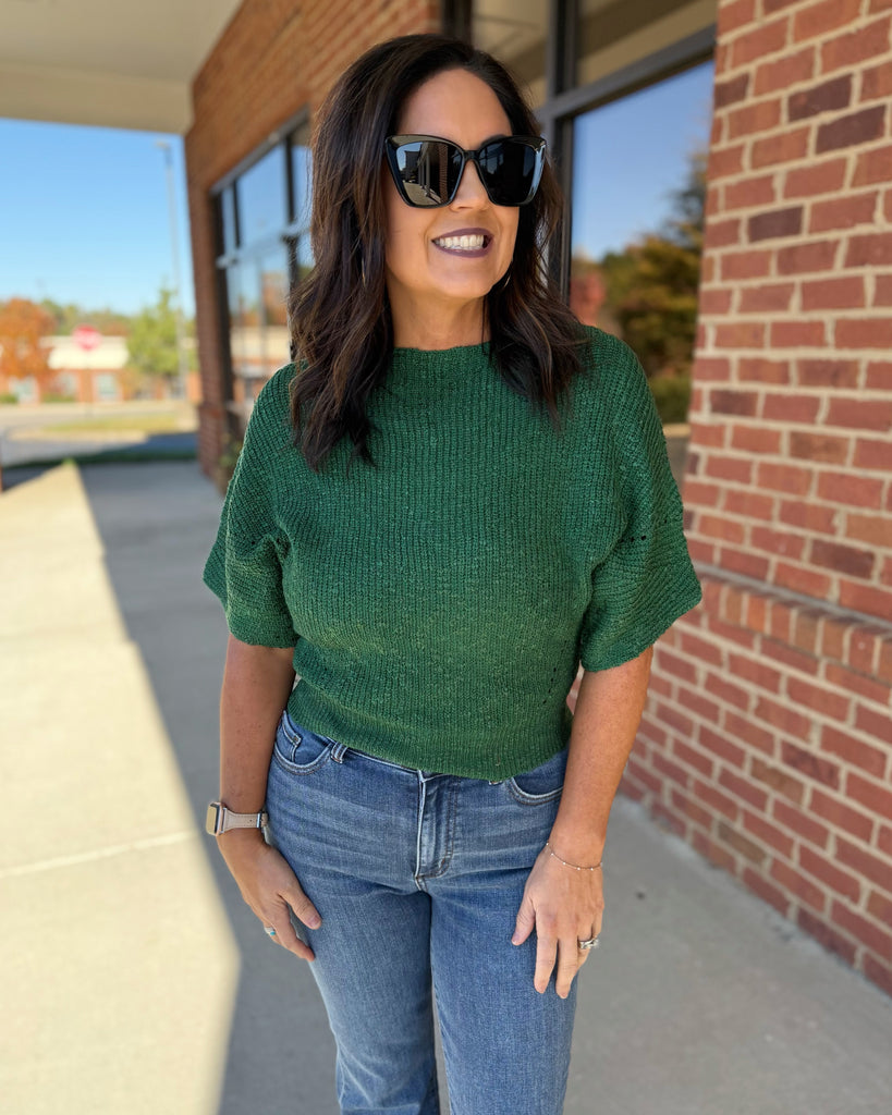 Effortlessly cozy meets casually chic. Our Ainsley textured knit sweater in hunter green features a soft boat neckline and relaxed dolman sleeves for a laid-back drape. Designed with drop shoulders, ribbed trim, and a slightly cropped silhouette, it delivers just the right mix of comfort and style—perfect for pairing with high-rise denim or layered over your favorite dress.