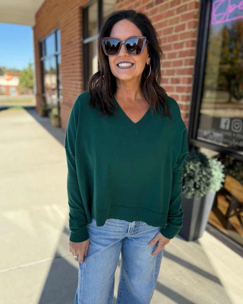 Cozy meets chic in our Aspen effortlessly stylish sweater. Crafted from a soft knit fabric, it features a relaxed, boxy silhouette with a flattering V-neckline, dropped shoulders, and ribbed trim at the cuffs and hem. Subtle side slits add movement and comfort, making it the perfect go-to piece for layering or wearing solo. The rich hunter green hue adds a touch of seasonal sophistication to any look.