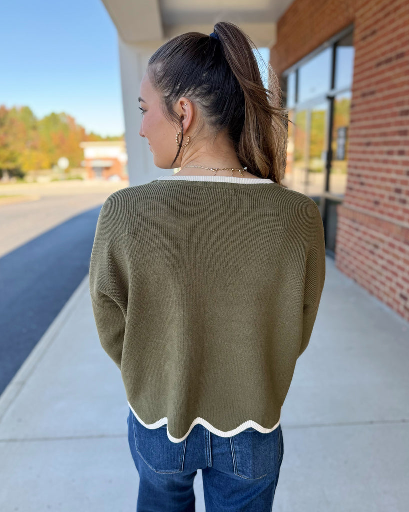 Our Bianca long sleeve sweater top brings a touch of charm to your everyday look with its scalloped hem and contrast edge detailing. Crafted from a soft, cozy knit, it features a relaxed fit and classic crew neckline for effortless comfort and style. The olive and cream color combination adds a refined, modern contrast that pairs beautifully with denim, skirts, or tailored pants. Feminine with a subtle statement, this sweater is the perfect blend of timeless and trendy.