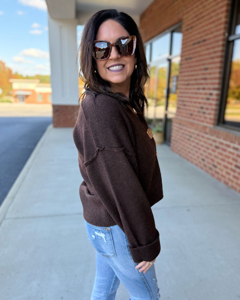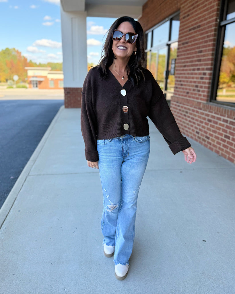 Cozy meets classic in our Claire Long Sleeve Button Down Knit Sweater Cardigan in brown. Crafted from a soft, midweight knit, it features a timeless button-front design, ribbed cuffs and hem, and a relaxed silhouette perfect for layering. The rich brown hue adds warmth and versatility, making it an effortless piece to dress up or down throughout the season.