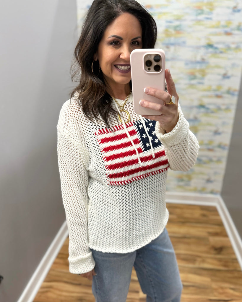 The airy knit keeps it cool and comfortable, making it perfect for warm days, beach trips, backyard BBQs, or layering over a tank or bralette for an easy, all-American look. The relaxed fit and hoodie detail add that casual, sporty vibe we all love.