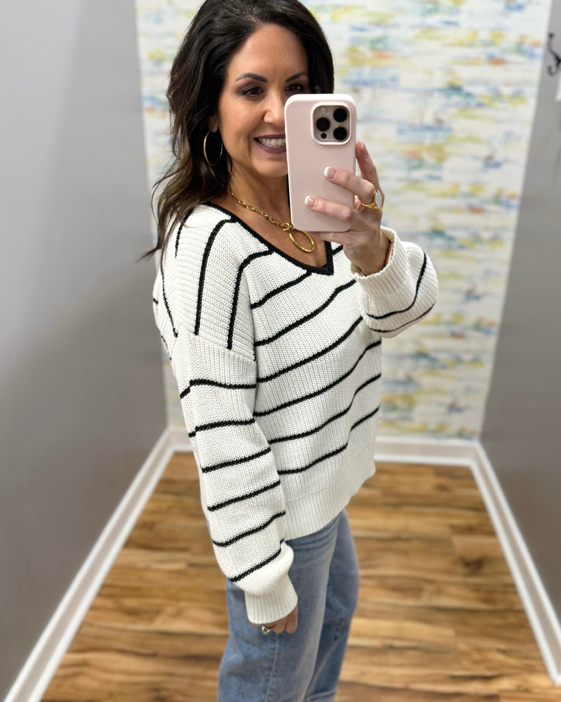 Meet your new everyday favorite. Our Peyton Striped V-Neck Sweater in White/Navy blends classic style with cozy comfort for a look that’s effortlessly put together. Designed in a soft, medium-weight knit, it’s warm enough for chilly mornings but breathable enough to wear all day.
