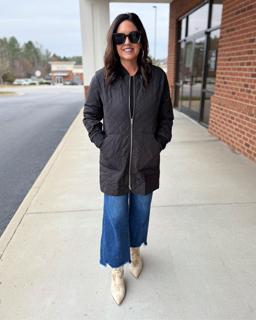 Featuring a full zipper front, double-layered hip pockets, and ribbed cuffs, this jacket keeps things sleek while adding everyday ease. Side zipper detailing allows you to create optional slits for added movement and style, while a hidden sleeve pocket with zipper closure keeps your essentials secure and within reach.
