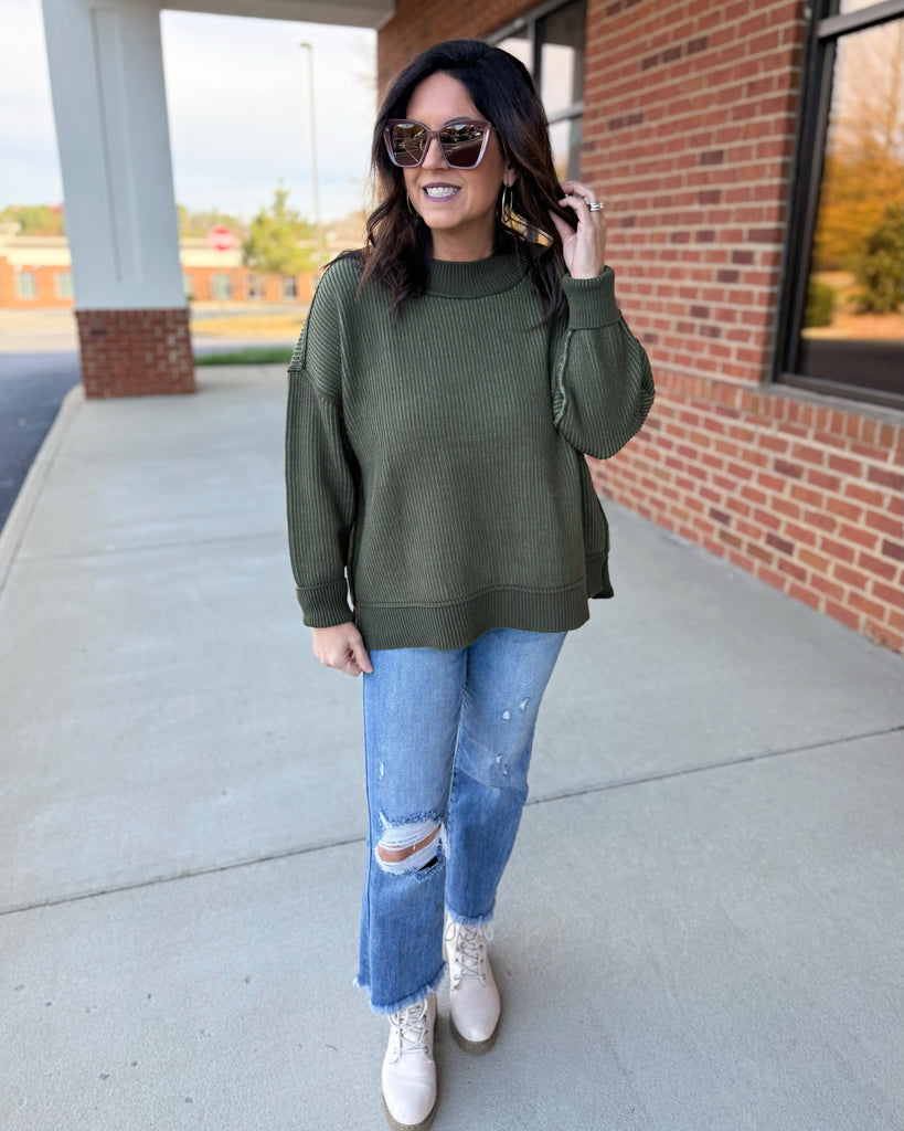 Elevate your everyday style with our Tammy chic two-tone sweater in dark olive, designed with eye-catching exposed seams for a modern, lived-in look. The soft knit fabric drapes effortlessly, while the hi-low hem and side slits add movement, comfort, and an ultra-flattering fit.