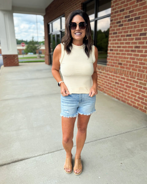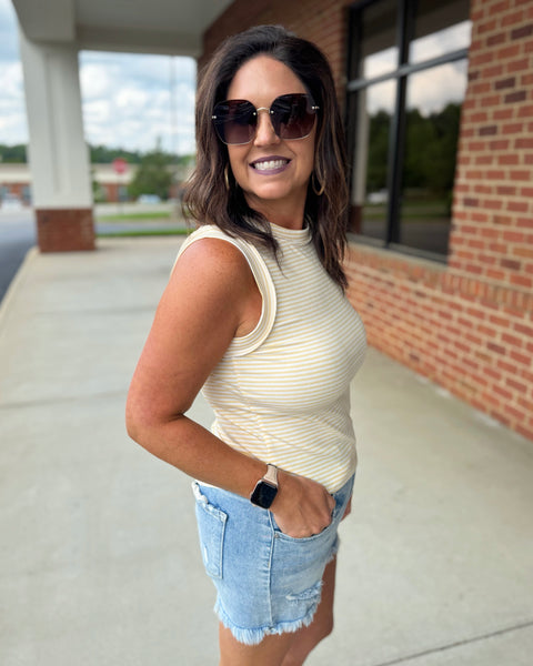 Our Bianca Basic Tank in Lemon is the cutest summertime tank! Featuring a raw hem stitching look on the outside, raw curved waist hemline that is so flattering, and a patch detail on the back. Fabric is a high quality striped rib that has a perfect medium thickness. The BEST basic tank! You will LOVE it!