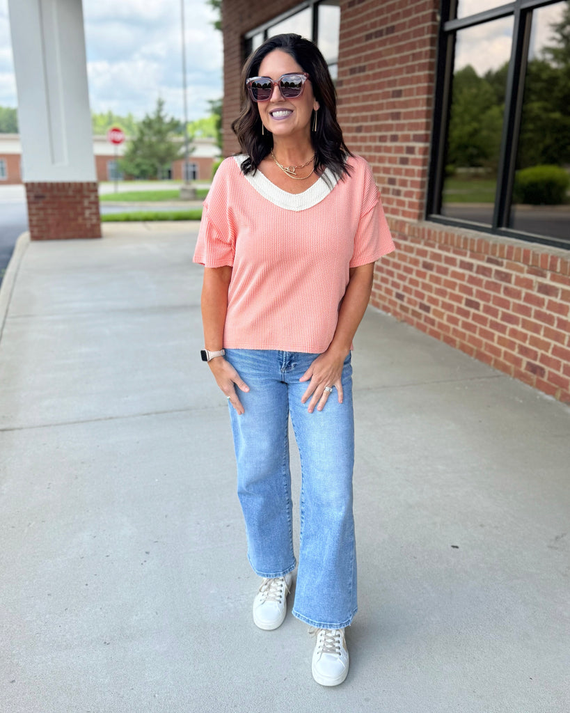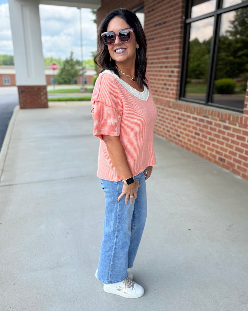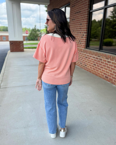 Elevate your casual wardrobe with our Kali Textured Top in Apricot. Crafted from a soft, textured knit fabric, this top features a bold contrasting collar that adds a modern twist to a timeless silhouette. The relaxed short sleeves and raw edge hemline lend an easygoing, lived-in feel, while the boxy fit offers flattering comfort for all-day wear. Perfect for layering or wearing solo, this versatile piece transitions seamlessly from laid-back outings to off-duty chic.