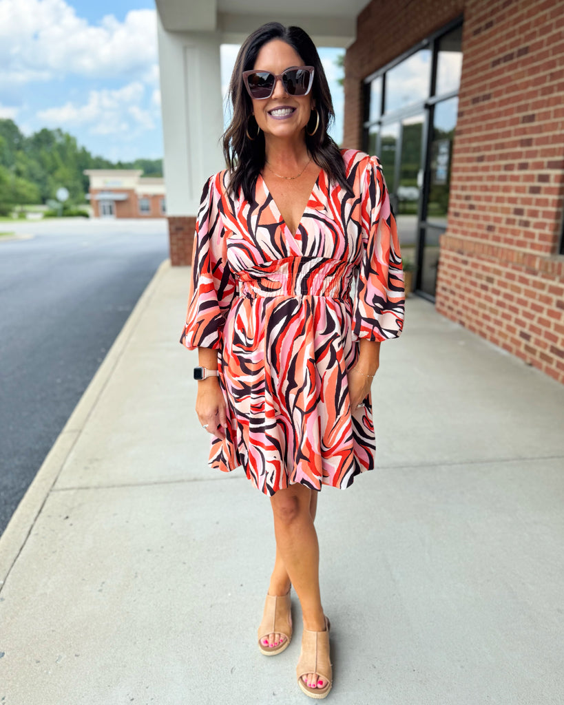 Turn heads this season in our Carol Dress – the perfect statement piece for fall weddings and special occasions. Designed with a flattering elastic waistband, this dress effortlessly cinches at the waist for a feminine silhouette, while the soft woven fabric flows beautifully with every step. The eye-catching allover print adds artistic flair, and the voluminous half sleeves lend just the right amount of drama. Pair it with heels and simple accessories for an elevated look that’s chic, comfortable, and event-ready.