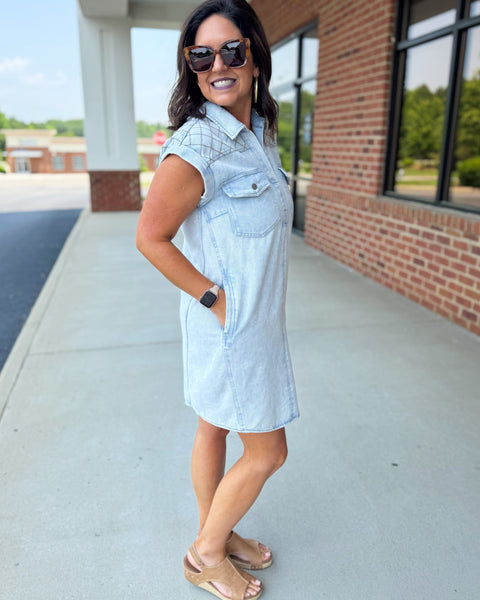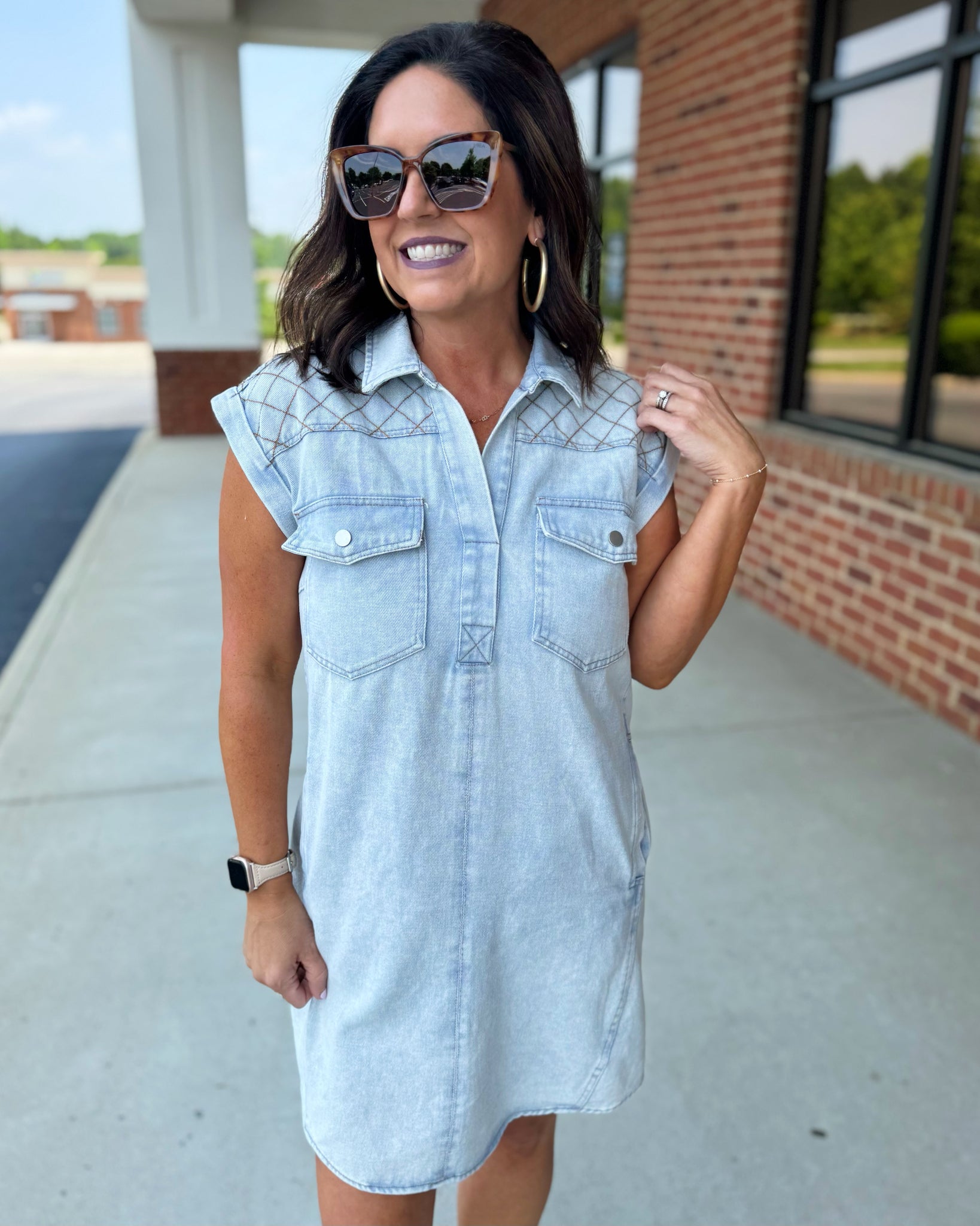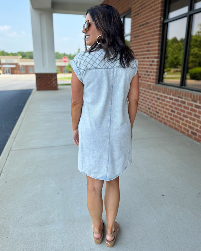 Effortlessly cool and endlessly versatile, our Diana Twill Dress in Light Denim is your go-to for laid-back style with a functional edge. Crafted from soft, garment-washed twill, this dress features subtle cap sleeves and stitched shoulder detailing that add structure and a touch of rugged charm. The relaxed silhouette is complemented by a flattering waist seam and convenient side pockets, making it as practical as it is stylish. Perfect for everyday wear, concerts, or casual summer plans — just add sneakers, wedges or boots and go.