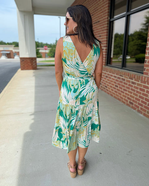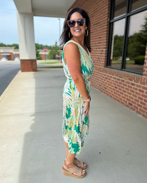 Step into vacation mode with our Emerson Tropical Print Surplice Midi Dress — the ultimate blend of breezy charm and flattering design. This sleeveless dress features a surplice neckline for a timeless wrap-style look, while the adjustable waist tie cinches your silhouette just right. The vibrant tropical print brings a playful, sunny vibe to any occasion, and the midi length adds a touch of elegance. Lightweight and easy to wear, it's perfect for summer getaways, beach dinners, or casual days under the sun.