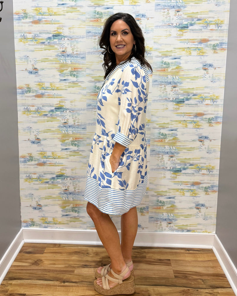 Easy, effortless, and full of charm—our Emery woven print mini dress is a go-to for everyday wear. Designed in a beautiful blue hue, it features eye-catching striped contrast details that add just the right touch of interest. The relaxed mini silhouette keeps things comfortable, while functional pockets make it as practical as it is cute. Finished with 3/4 sleeves for easy, all-season styling, this dress is perfect for busy days when you still want to look put together.