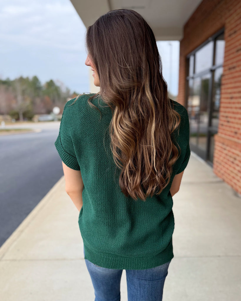 A polished basic with effortless charm. Our Erica short sleeve sweater in Dark Green features a clean center seam detail that adds subtle interest to the front, while side slits create easy movement and a flattering, relaxed drape. Crafted in a soft knit with a comfortable fit, it’s the perfect elevated staple for layering or wearing solo throughout the seasons. Dress it up with trousers or keep it casual with denim—either way, it’s an easy yes.