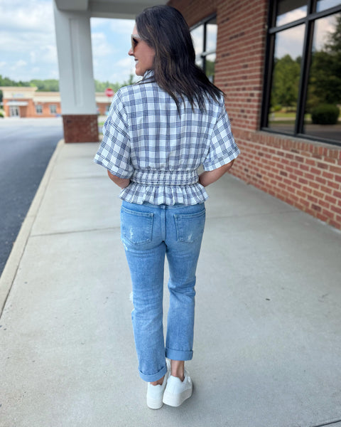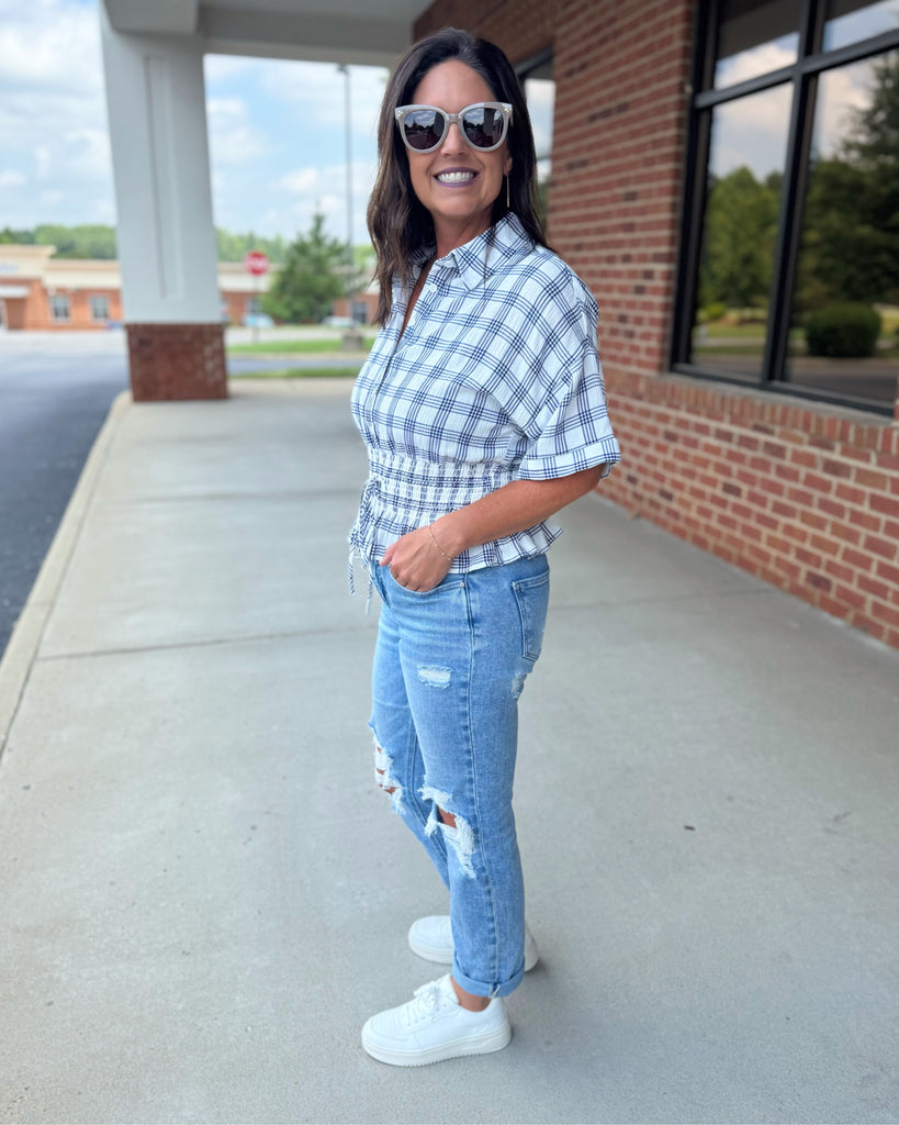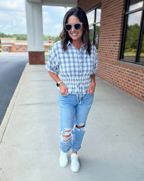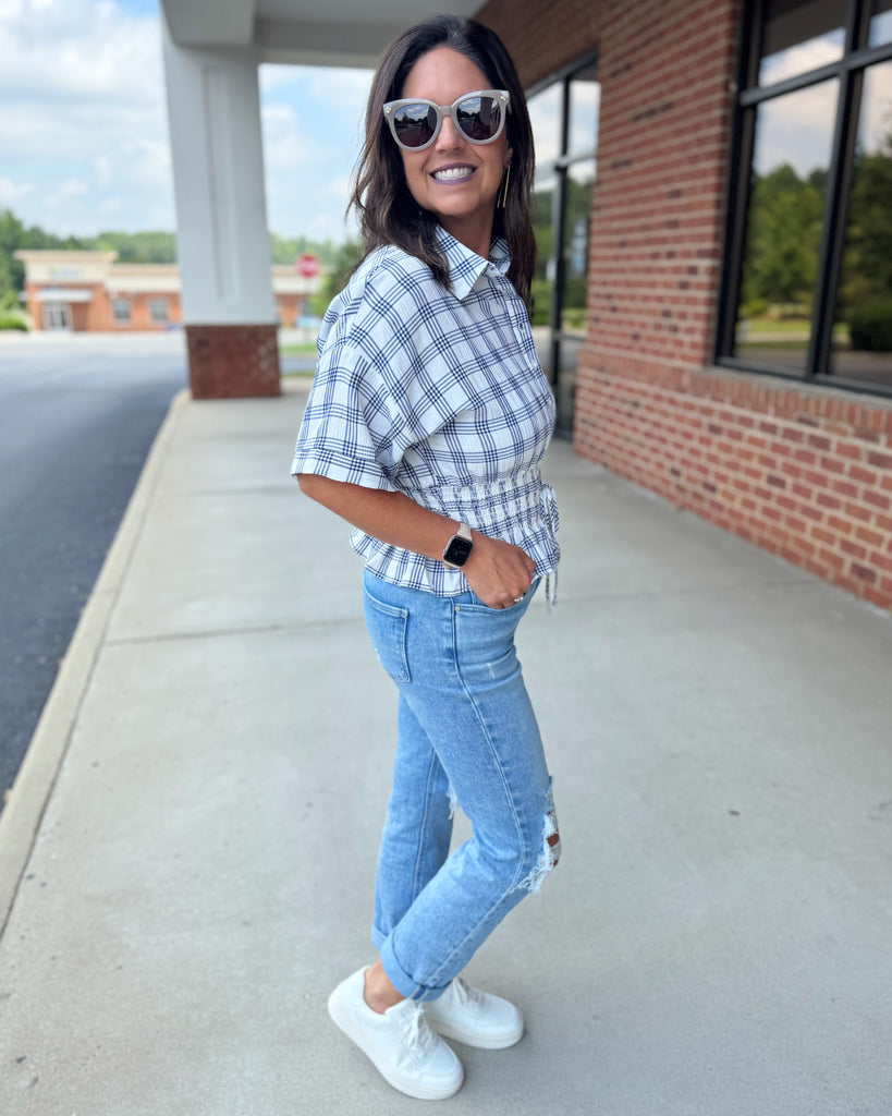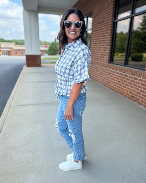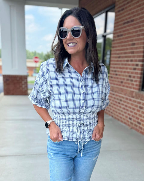 Add a touch of timeless charm to your wardrobe with our Evan Button-Up Short Sleeve Plaid Shirt in classic navy and white. Designed with a flattering smocked waist and adjustable front tie, this shirt combines comfort with effortless style. The lightweight fabric keeps things breezy, while the short sleeves and button-up front give it a casual, laid-back feel. Perfect for pairing with high-rise denim, shorts, or your favorite skirts, it’s the ultimate warm-weather staple with a feminine twist.