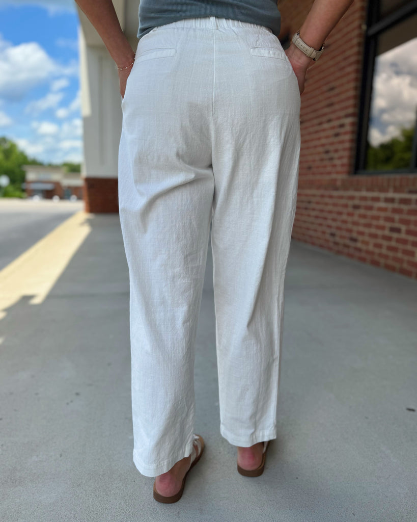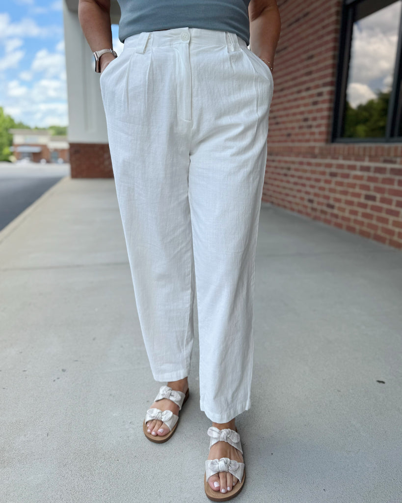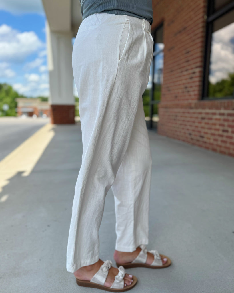 Elevate your everyday style with our Julie Cotton Pleated Pants in off white—where tailored structure meets effortless comfort. Designed with classic belt loops and a button-and-zip front closure for a polished look, these pants also feature an elasticized back waistband that ensures a flexible, flattering fit. Crisp front pleats add a touch of sophistication, while functional side pockets provide convenience on the go. Whether dressed up with a blouse or kept casual with a tee, these versatile pants are a timeless wardrobe staple.